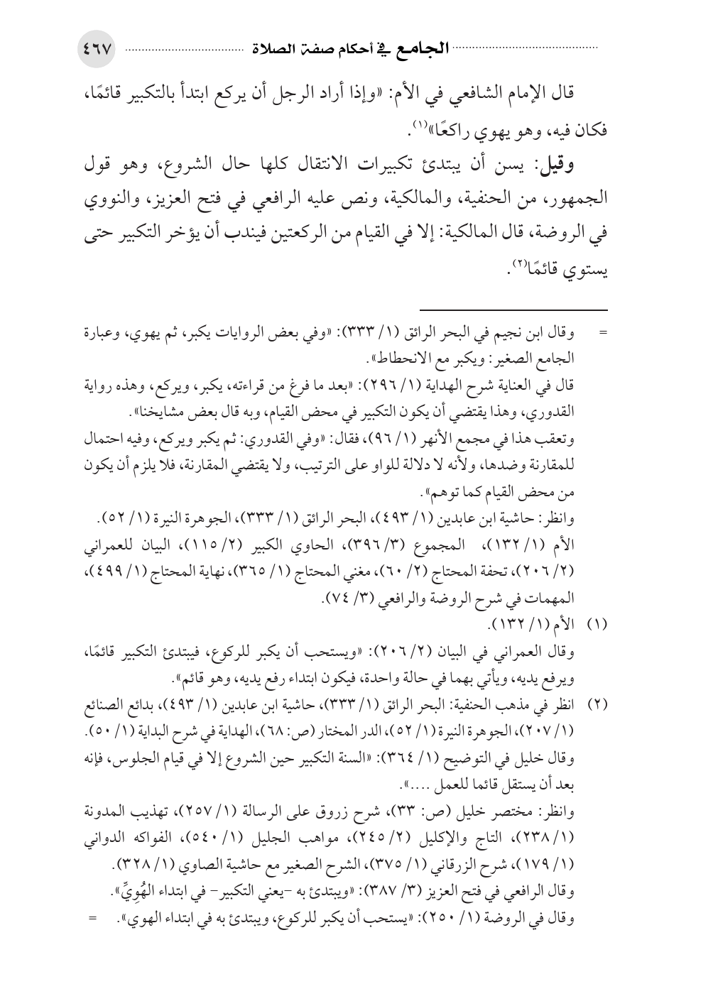 وقال في العباب المحيط (١/ ٣٤٧): «ويسن أن يبدأ بتكبيرة الانتقال قائمًا، لا مع ابتداء هويه خلافًا للعزيز والروضة».