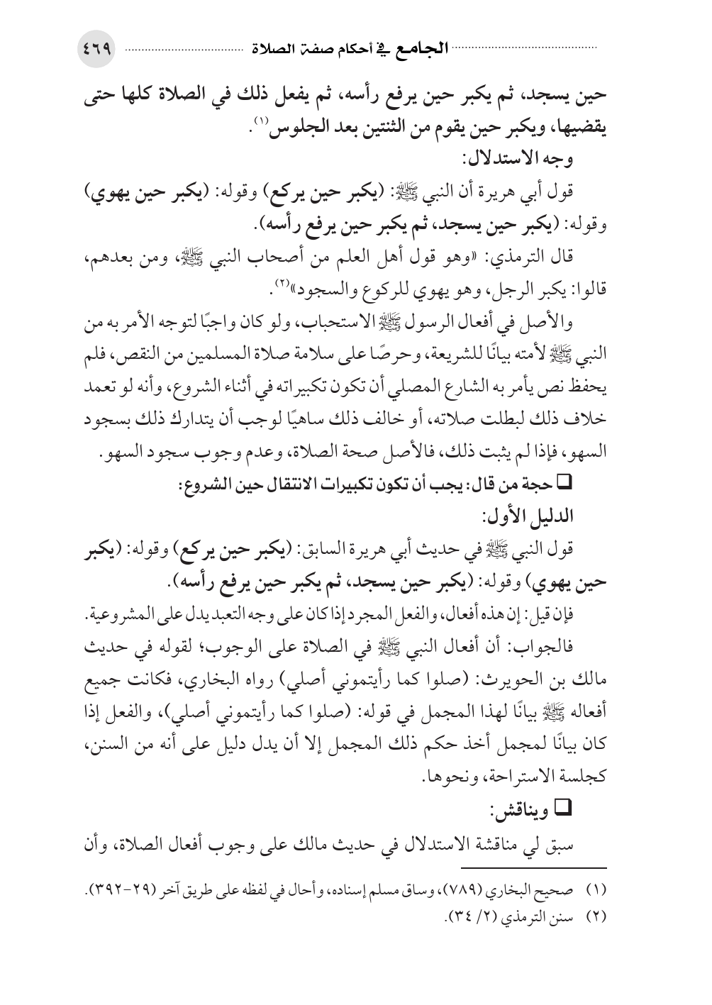 والأصل في أفعال الرسول - صلى الله عليه وسلم - الاستحباب، ولو كان واجبًا لتوجه الأمر به من النبي - صلى الله عليه وسلم - لأمته بيانًا للشريعة، وحرصًا على سلامة صلاة المسلمين من النقص، فلم يحفظ نص يأمر به الشارع المصلي أن تكون تكبيراته في أثناء الشروع، وأنه لو تعمد خلاف ذلك لبطلت صلاته، أو خالف ذلك ساهيًا لوجب أن يتدارك ذلك بسجود السهو، فإذا لم يثبت ذلك، فالأصل صحة الصلاة، وعدم وجوب سجود السهو.