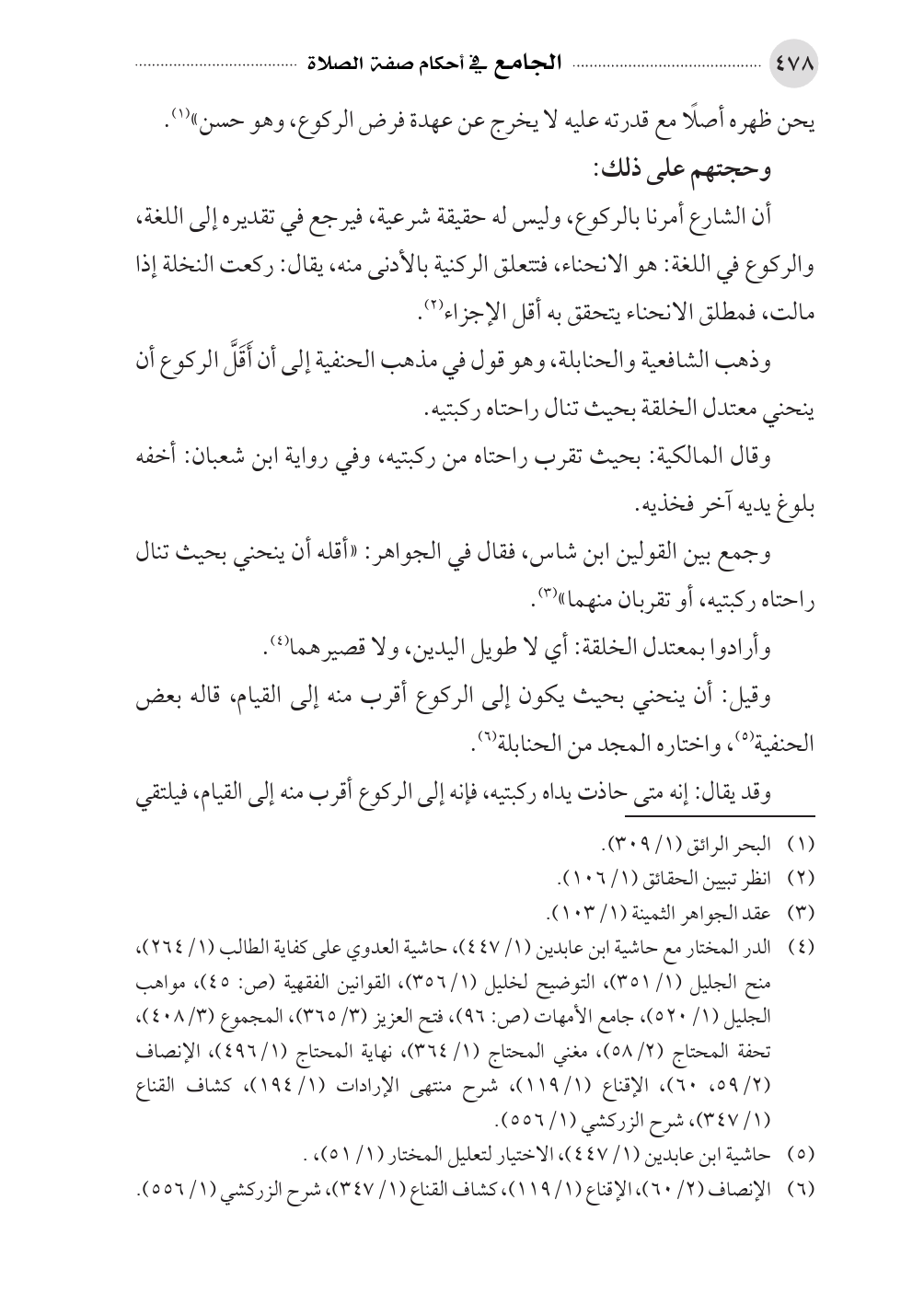 وجمع بين القولين ابن شاس، فقال في الجواهر: «أقله أن ينحني بحيث تنال راحتاه ركبتيه، أو تقربان منهما» (¬٣).