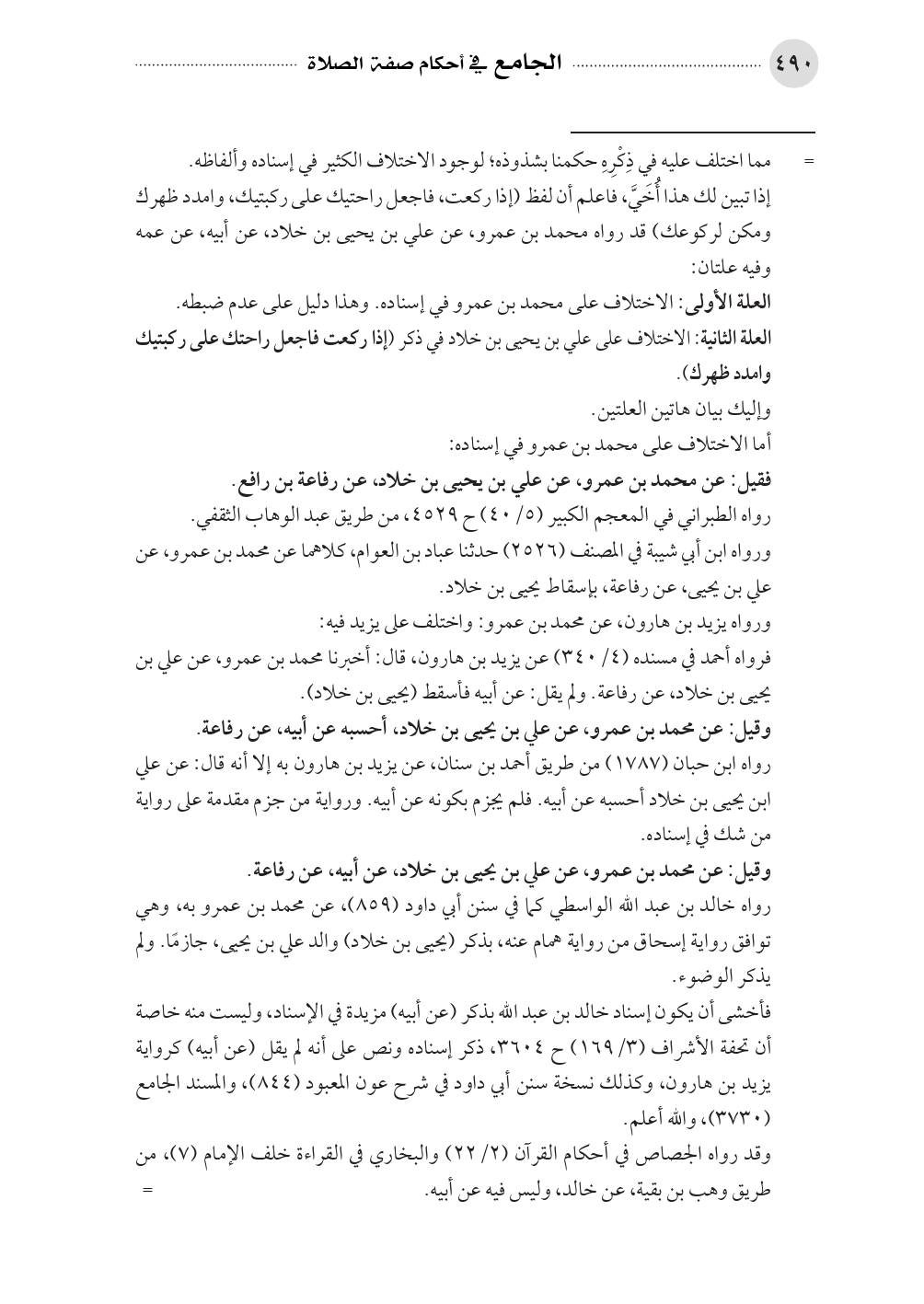 إذا تبين لك هذا أُخَيَّ، فاعلم أن لفظ (إذا ركعت، فاجعل راحتيك على ركبتيك، وامدد ظهرك ومكن لركوعك) قد رواه محمد بن عمرو، عن علي بن يحيى بن خلاد، عن أبيه، عن عمه وفيه علتان: