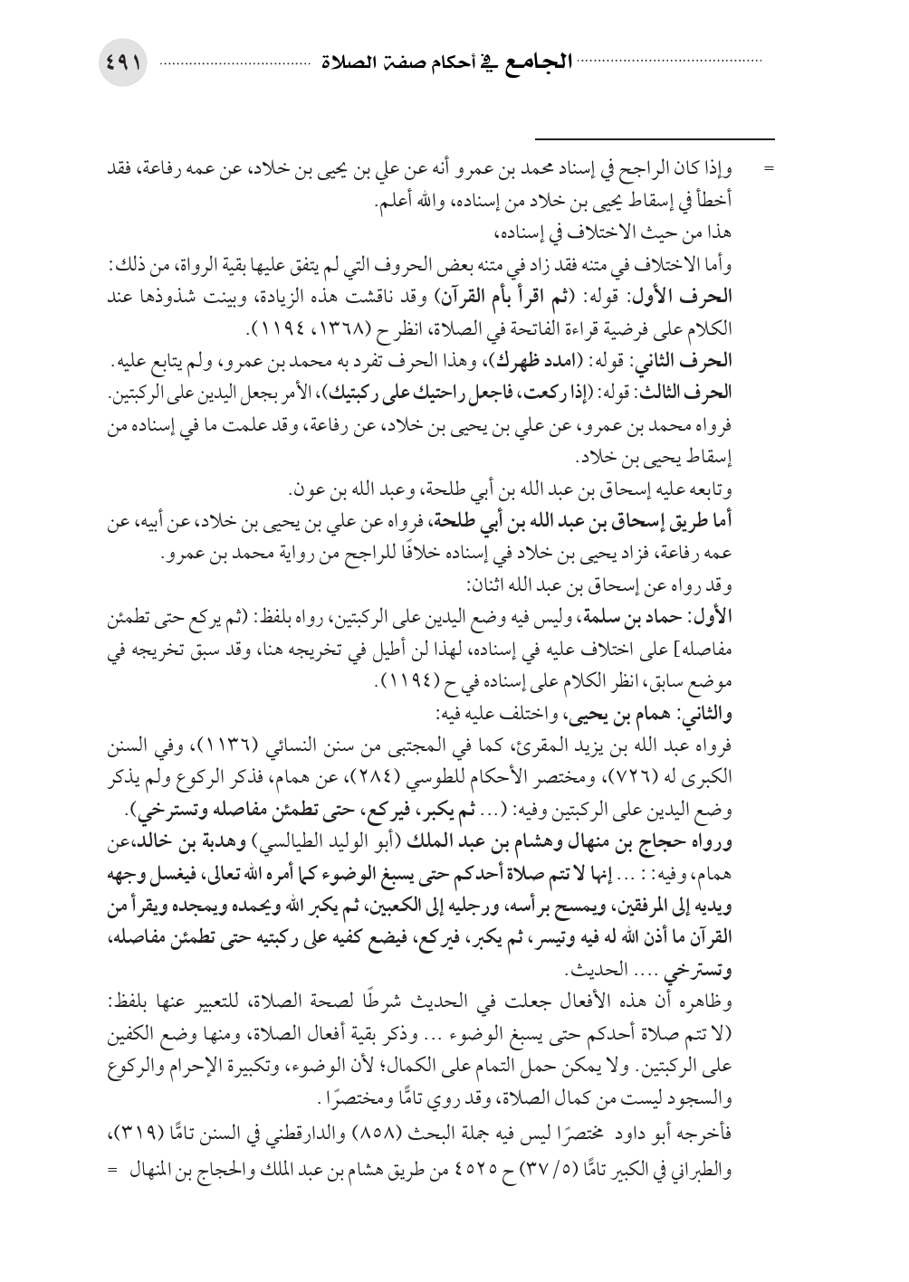 = وإذا كان الراجح في إسناد محمد بن عمرو أنه عن علي بن يحيى بن خلاد، عن عمه رفاعة، فقد أخطأ في إسقاط يحيى بن خلاد من إسناده، والله أعلم.
