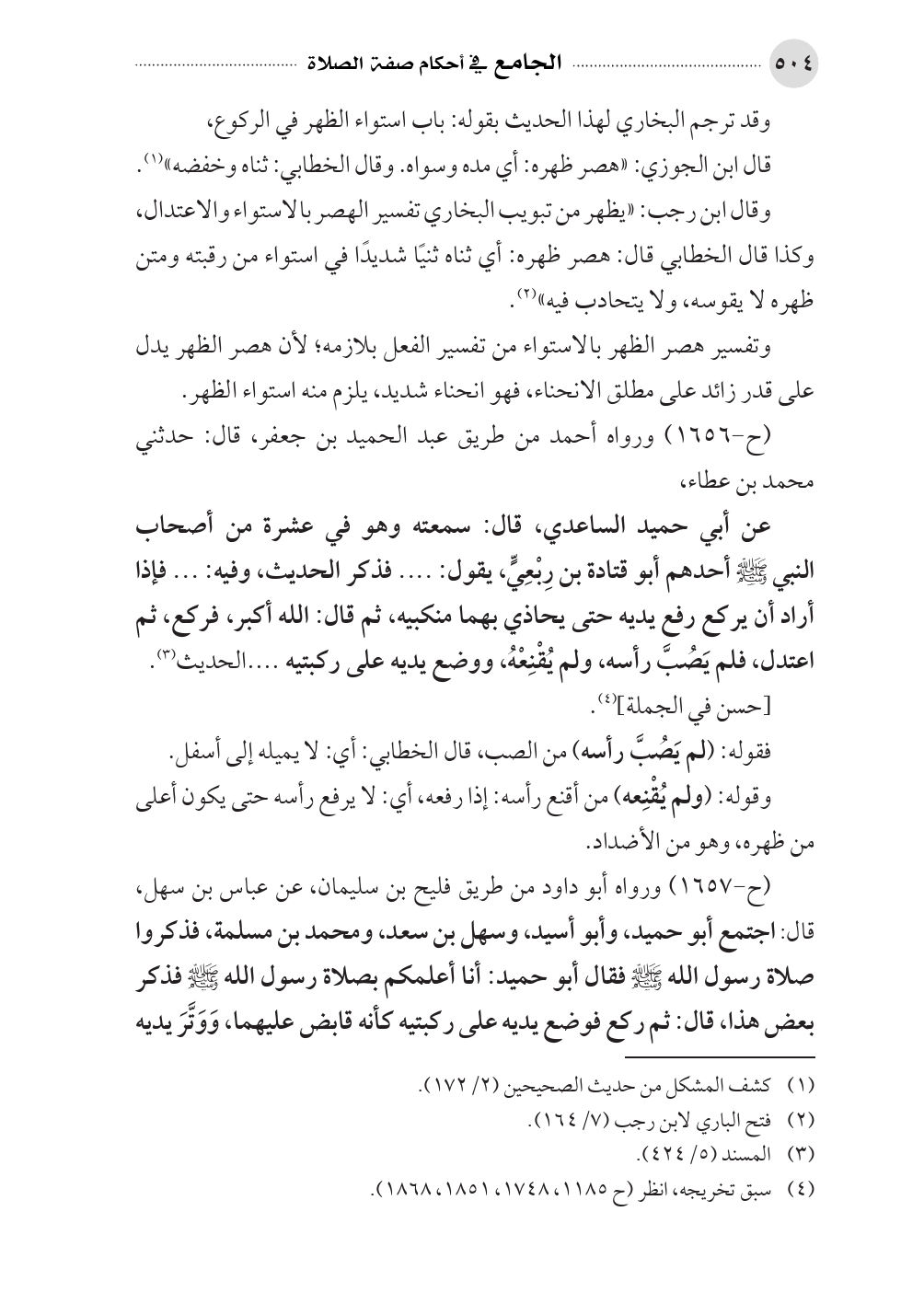 (ح-١٦٥٧) ورواه أبو داود من طريق فليح بن سليمان، عن عباس بن سهل، قال: اجتمع أبو حميد، وأبو أسيد، وسهل بن سعد، ومحمد بن مسلمة، فذكروا صلاة رسول الله - صلى الله عليه وسلم - فقال أبو حميد: أنا أعلمكم بصلاة رسول الله - صلى الله عليه وسلم - فذكر بعض هذا، قال: ثم ركع فوضع يديه على ركبتيه كأنه قابض عليهما، وَوَتَّرَ يديه
