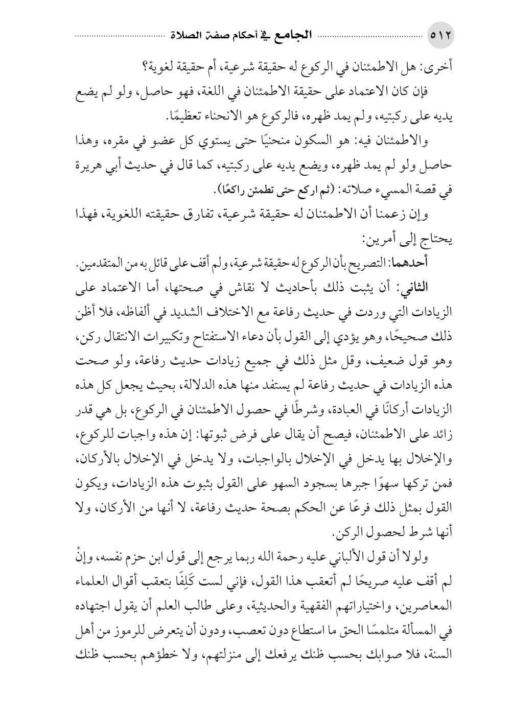 الثاني: أن يثبت ذلك بأحاديث لا نقاش في صحتها، أما الاعتماد على الزيادات التي وردت في حديث رفاعة مع الاختلاف الشديد في ألفاظه، فلا أظن ذلك صحيحًا، وهو يؤدي إلى القول بأن دعاء الاستفتاح وتكبيرات الانتقال ركن، وهو قول ضعيف، وقل مثل ذلك في جميع زيادات حديث رفاعة، ولو صحت هذه الزيادات في حديث رفاعة لم يستفد منها هذه الدلالة، بحيث يجعل كل هذه الزيادات أركانًا في العبادة، وشرطًا في حصول الاطمئنان في الركوع، بل هي قدر زائد على الاطمئنان، فيصح أن يقال على فرض ثبوتها: إن هذه واجبات للركوع، والإخلال بها يدخل في الإخلال بالواجبات، ولا يدخل في الإخلال بالأركان، فمن تركها سهوًا جبرها بسجود السهو على القول بثبوت هذه الزيادات، ويكون القول بمثل ذلك فرعًا عن الحكم بصحة حديث رفاعة، لا أنها من الأركان، ولا أنها شرط لحصول الركن.