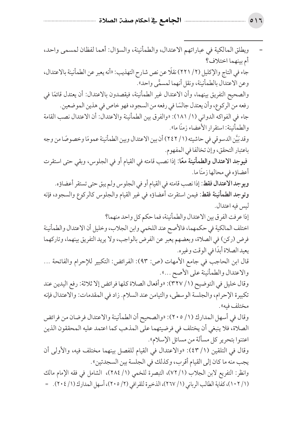 جاء في التاج والإكليل (٢/ ٢٢١) نقلًا عن نص شارح التهذيب: «أنه يعبر عن الطمأنينة بالاعتدال، وعن الاعتدال بالطمأنينة، ونقل أنهما لمسمًّى واحد».
