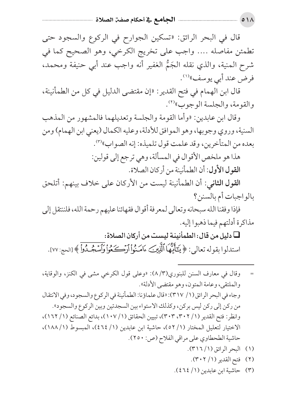 قال في البحر الرائق: «تسكين الجوارح في الركوع والسجود حتى تطمئن مفاصله .... واجب على تخريج الكرخي، وهو الصحيح كما في شرح المنية، والذي نقله الجَمُّ الغفير أنه واجب عند أبي حنيفة ومحمد، فرض عند أبي يوسف» (¬١).