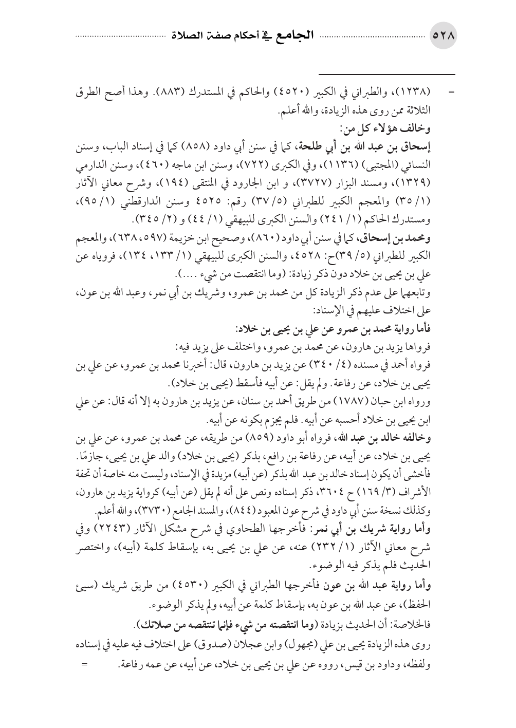 روى هذه الزيادة يحيى بن علي (مجهول) وابن عجلان (صدوق) على اختلاف فيه عليه في إسناده ولفظه، وداود بن قيس، رووه عن علي بن يحيى بن خلاد، عن أبيه، عن عمه رفاعة. =