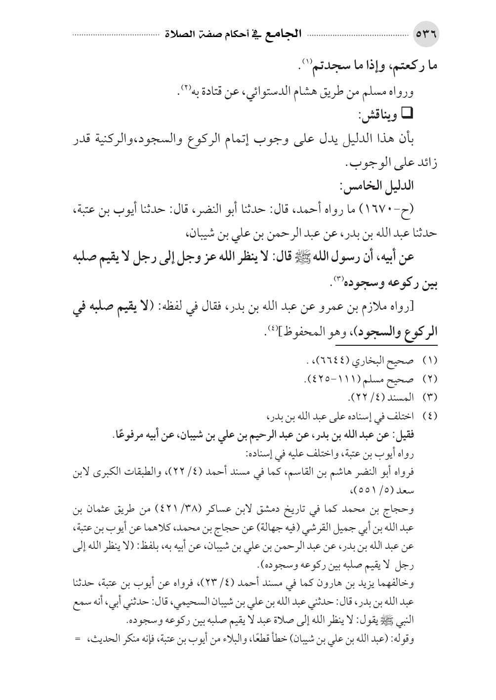 وخالفهما يزيد بن هارون كما في مسند أحمد (٤/ ٢٣)، فرواه عن أيوب بن عتبة، حدثنا عبد الله بن بدر، قال: حدثني عبد الله بن علي بن شيبان السحيمي، قال: حدثني أبي، أنه سمع النبي - صلى الله عليه وسلم - يقول: لا ينظر الله إلى صلاة عبد لا يقيم صلبه بين ركوعه وسجوده.