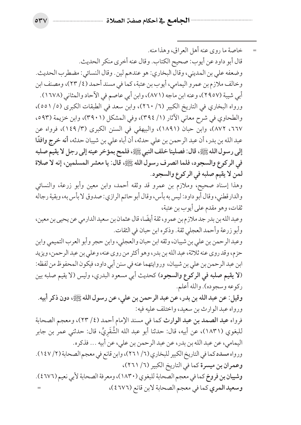 وعبد الرحمن بن علي بن شيبان، وثقه ابن حبان والعجلي، وابن حجر وأبو العرب التميمي وابن حزم، وقد روى عنه ثلاثة، عبد الله بن بدر، وهو أكثر من روى عنه، وعلي بن عبد الرحمن، ويزيد ابن عبد الرحمن بن علي بن شيبان، وروايتهما عنه في سنن أبي داود، فيكون المحفوظ من لفظه: (لا يقيم صلبه في الركوع والسجود) كحديث أبي مسعود البدري، وليس (لا يقيم صلبه بين ركوعه وسجوده). والله أعلم.