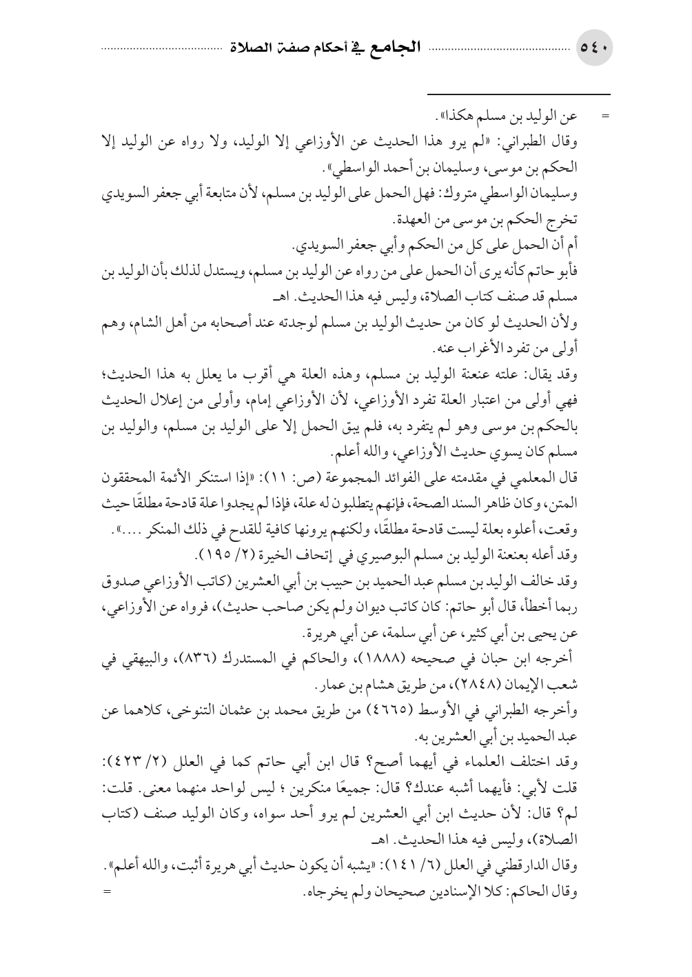 فأبو حاتم كأنه يرى أن الحمل على من رواه عن الوليد بن مسلم، ويستدل لذلك بأن الوليد بن مسلم قد صنف كتاب الصلاة، وليس فيه هذا الحديث. اهـ