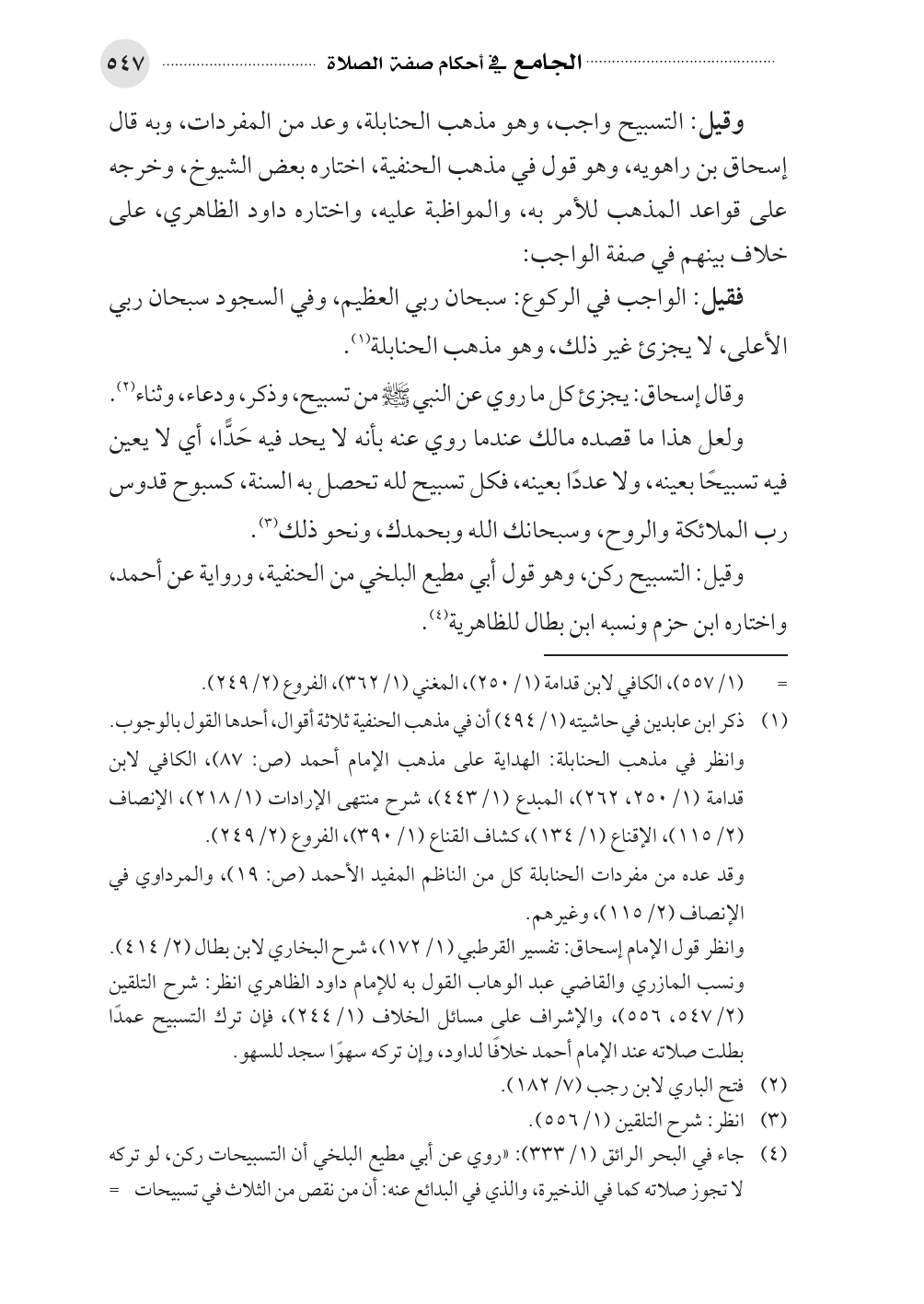 وقيل: التسبيح ركن، وهو قول أبي مطيع البلخي من الحنفية، ورواية عن أحمد، واختاره ابن حزم ونسبه ابن بطال للظاهرية (¬٤).