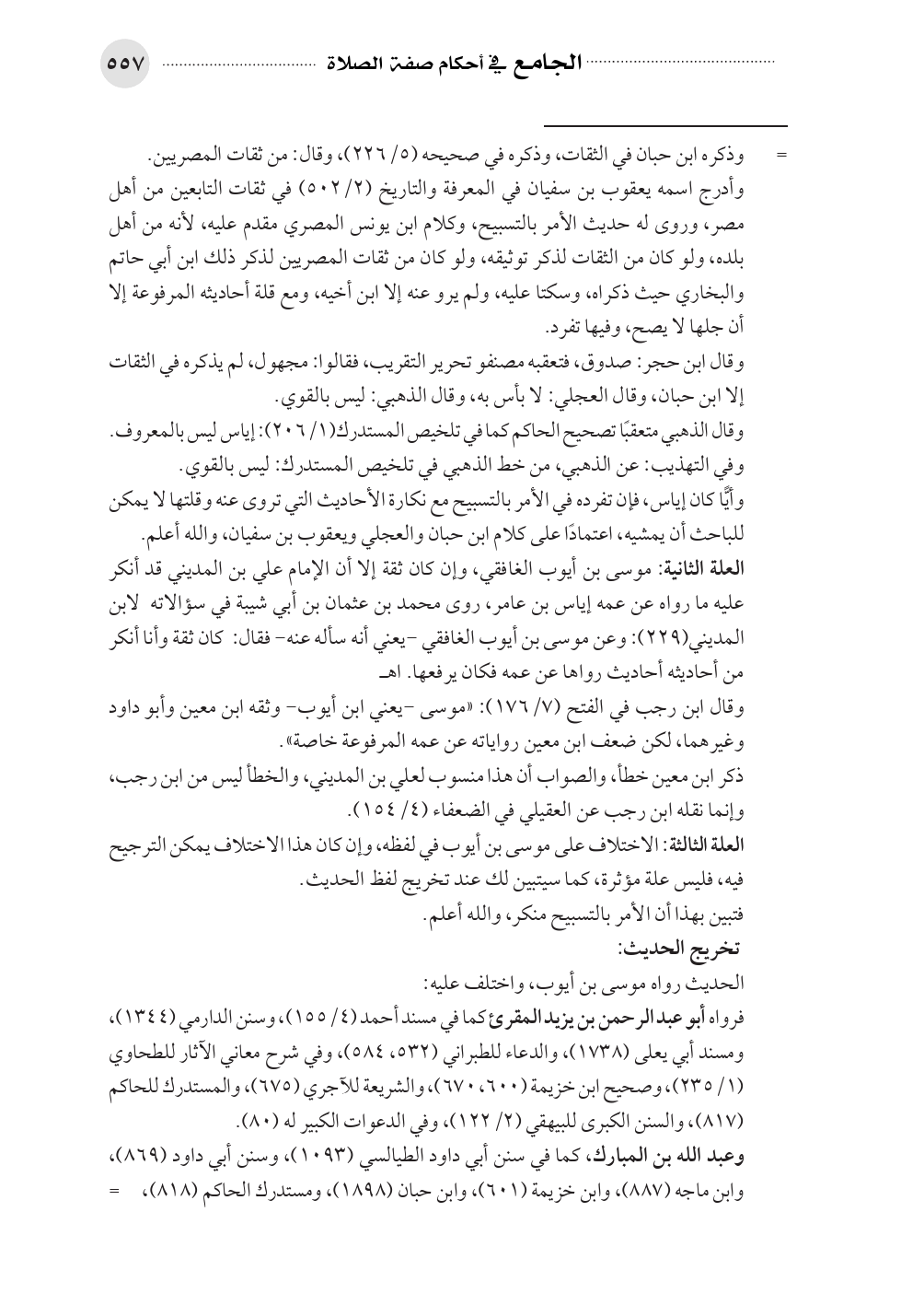 وقال ابن رجب في الفتح (٧/ ١٧٦): «موسى -يعني ابن أيوب- وثقه ابن معين وأبو داود وغيرهما، لكن ضعف ابن معين رواياته عن عمه المرفوعة خاصة».