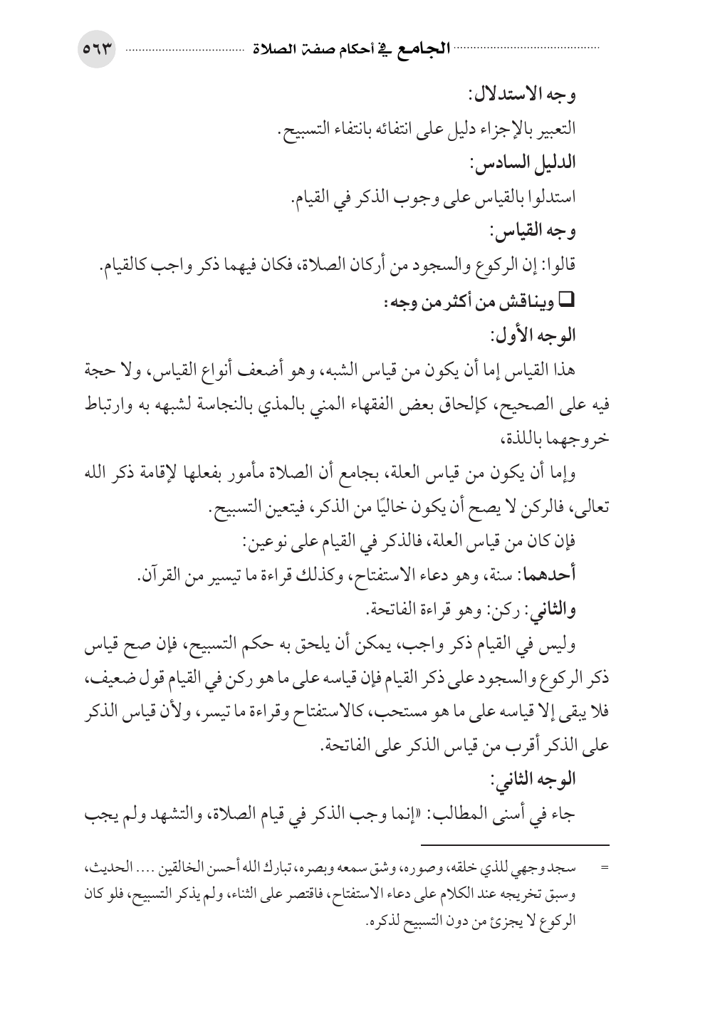 وإما أن يكون من قياس العلة، بجامع أن الصلاة مأمور بفعلها لإقامة ذكر الله تعالى، فالركن لا يصح أن يكون خاليًا من الذكر، فيتعين التسبيح.