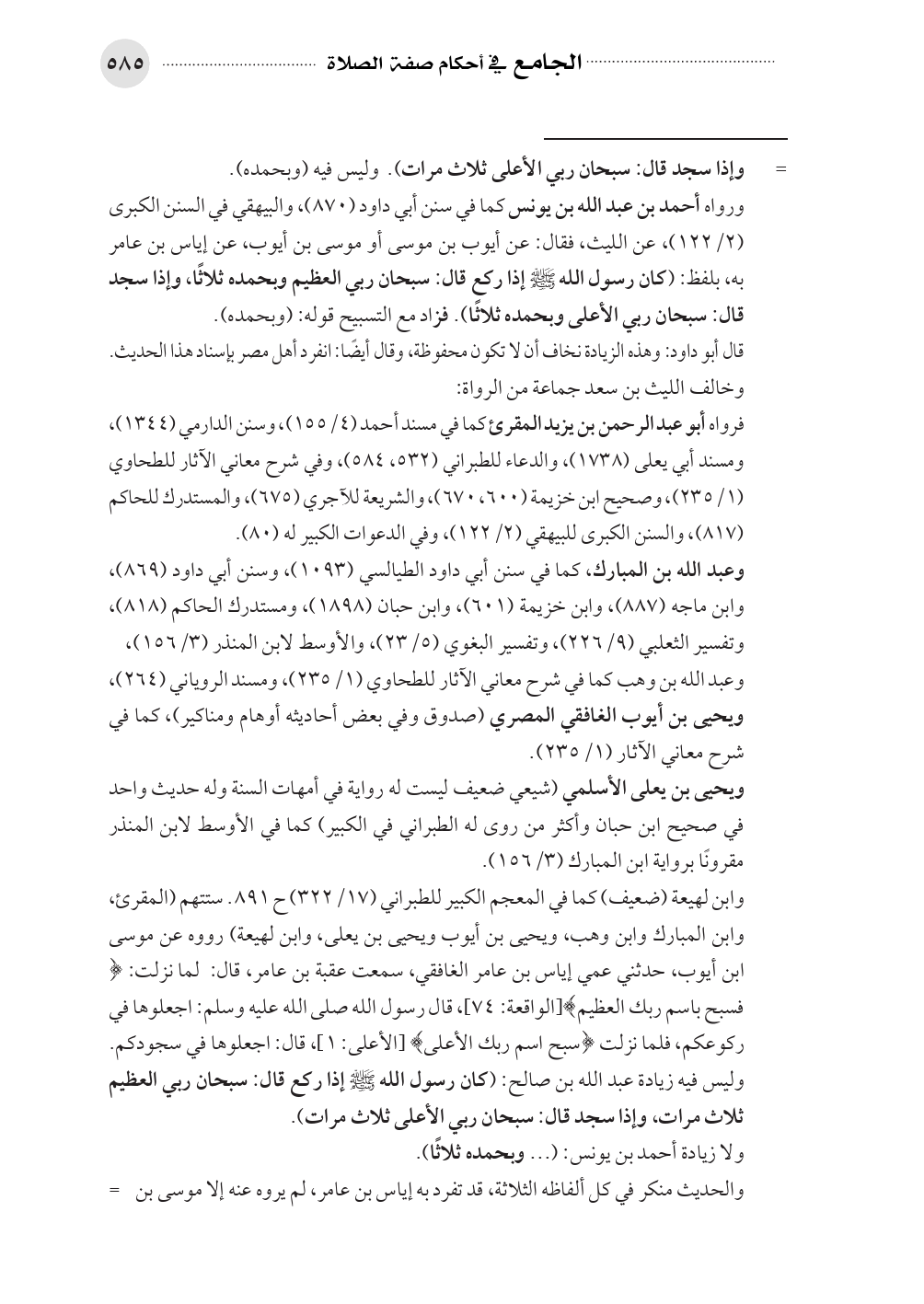 ورواه أحمد بن عبد الله بن يونس كما في سنن أبي داود (٨٧٠)، والبيهقي في السنن الكبرى (٢/ ١٢٢)، عن الليث، فقال: عن أيوب بن موسى أو موسى بن أيوب، عن إياس بن عامر به، بلفظ: (كان رسول الله - صلى الله عليه وسلم - إذا ركع قال: سبحان ربي العظيم وبحمده ثلاثًا، وإذا سجد قال: سبحان ربي الأعلى وبحمده ثلاثًا). فزاد مع التسبيح قوله: (وبحمده).