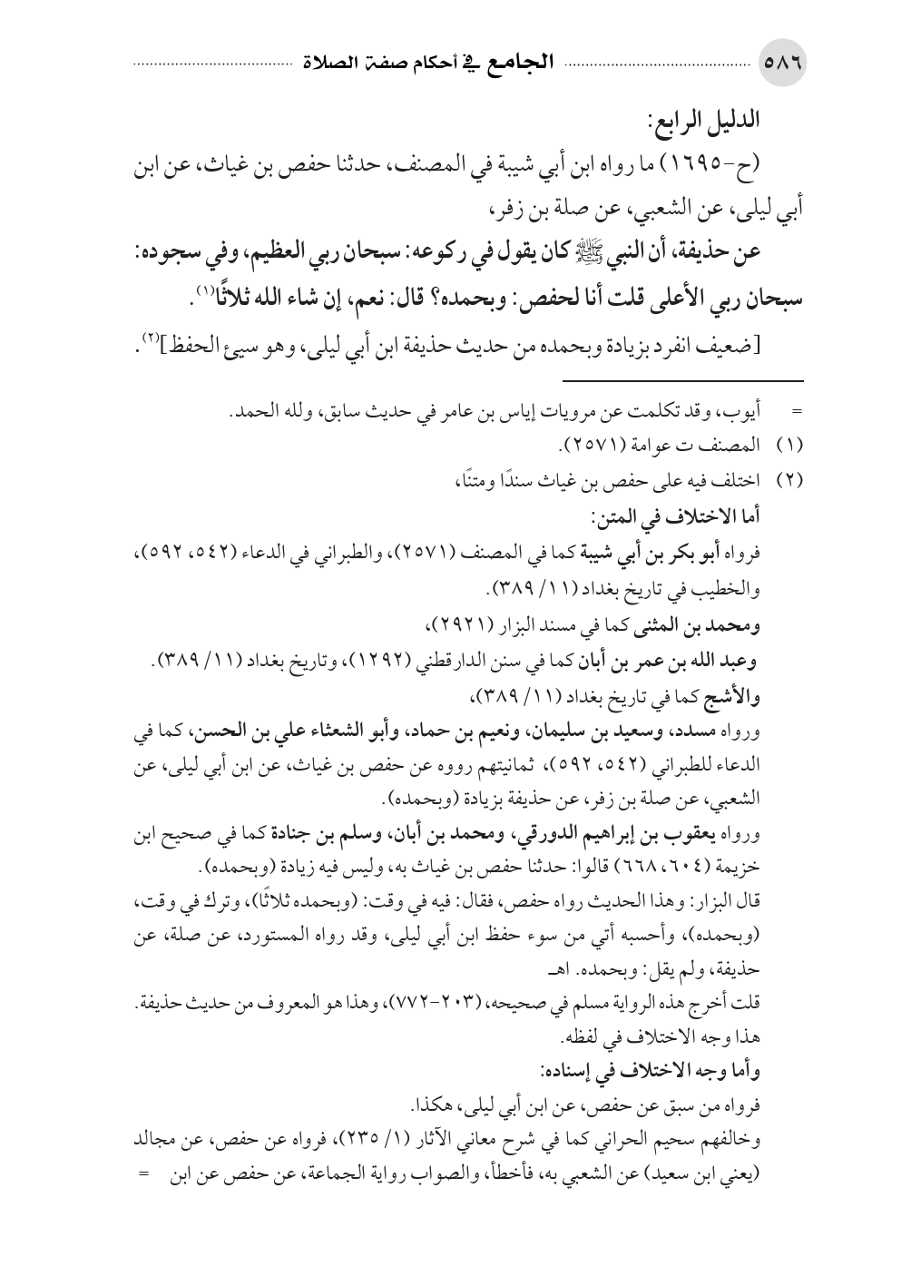 (ح-١٦٩٥) ما رواه ابن أبي شيبة في المصنف، حدثنا حفص بن غياث، عن ابن أبي ليلى، عن الشعبي، عن صلة بن زفر،