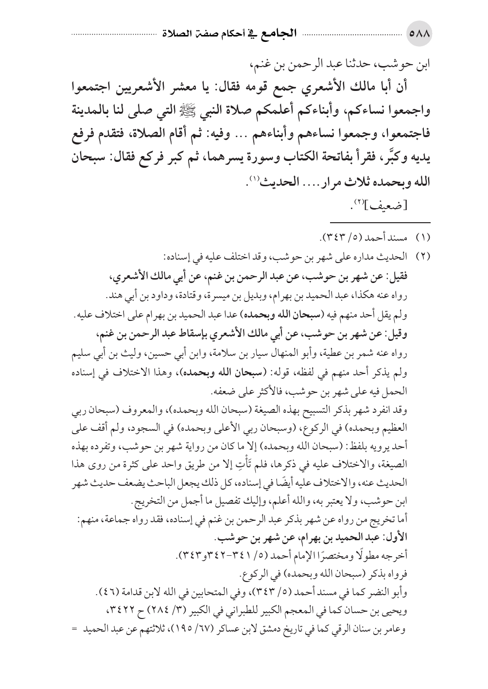 وقيل: عن شهر بن حوشب، عن أبي مالك الأشعري بإسقاط عبد الرحمن بن غنم،