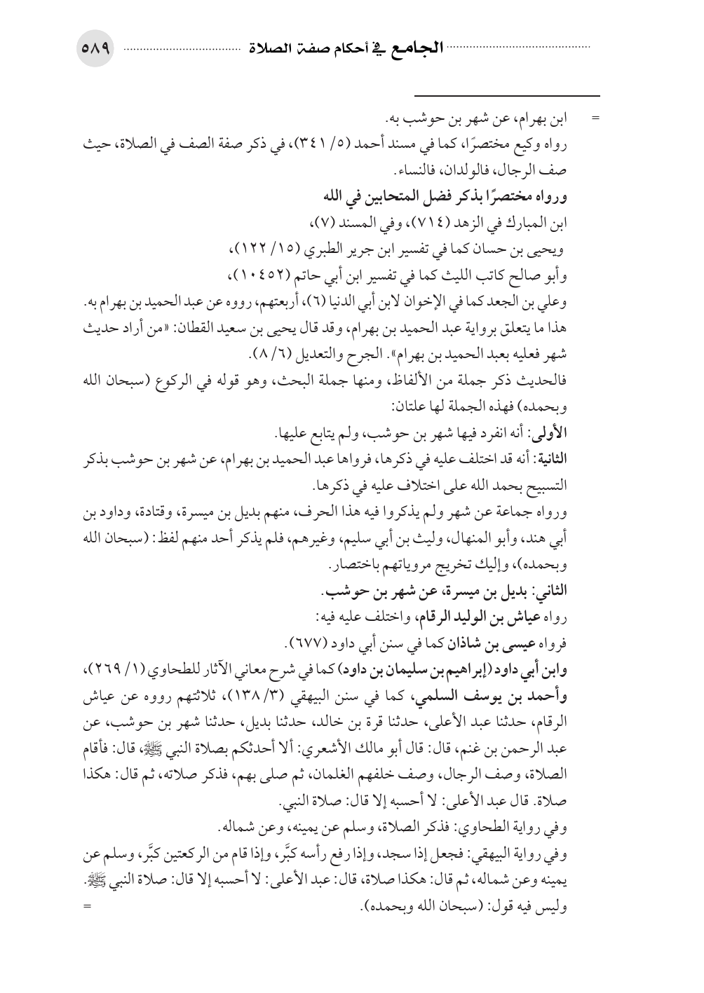 وأحمد بن يوسف السلمي، كما في سنن البيهقي (٣/ ١٣٨)، ثلاثتهم رووه عن عياش الرقام، حدثنا عبد الأعلى، حدثنا قرة بن خالد، حدثنا بديل، حدثنا شهر بن حوشب، عن عبد الرحمن بن غنم، قال: قال أبو مالك الأشعري: ألا أحدثكم بصلاة النبي - صلى الله عليه وسلم -، قال: فأقام الصلاة، وصف الرجال، وصف خلفهم الغلمان، ثم صلى بهم، فذكر صلاته، ثم قال: هكذا صلاة. قال عبد الأعلى: لا أحسبه إلا قال: صلاة النبي.