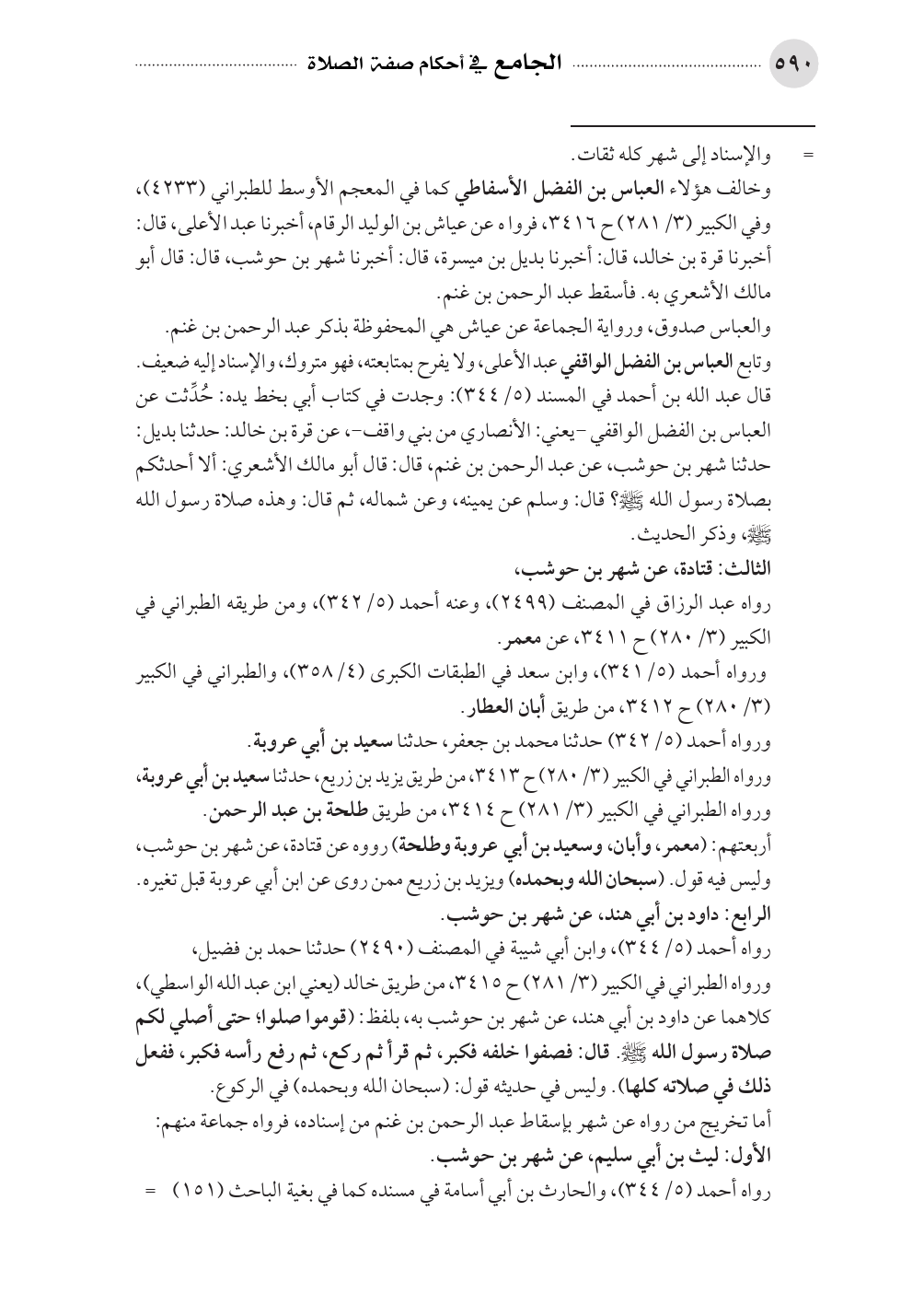 قال عبد الله بن أحمد في المسند (٥/ ٣٤٤): وجدت في كتاب أبي بخط يده: حُدِّثت عن العباس بن الفضل الواقفي -يعني: الأنصاري من بني واقف-، عن قرة بن خالد: حدثنا بديل: حدثنا شهر بن حوشب، عن عبد الرحمن بن غنم، قال: قال أبو مالك الأشعري: ألا أحدثكم بصلاة رسول الله - صلى الله عليه وسلم -؟ قال: وسلم عن يمينه، وعن شماله، ثم قال: وهذه صلاة رسول الله - صلى الله عليه وسلم -، وذكر الحديث.