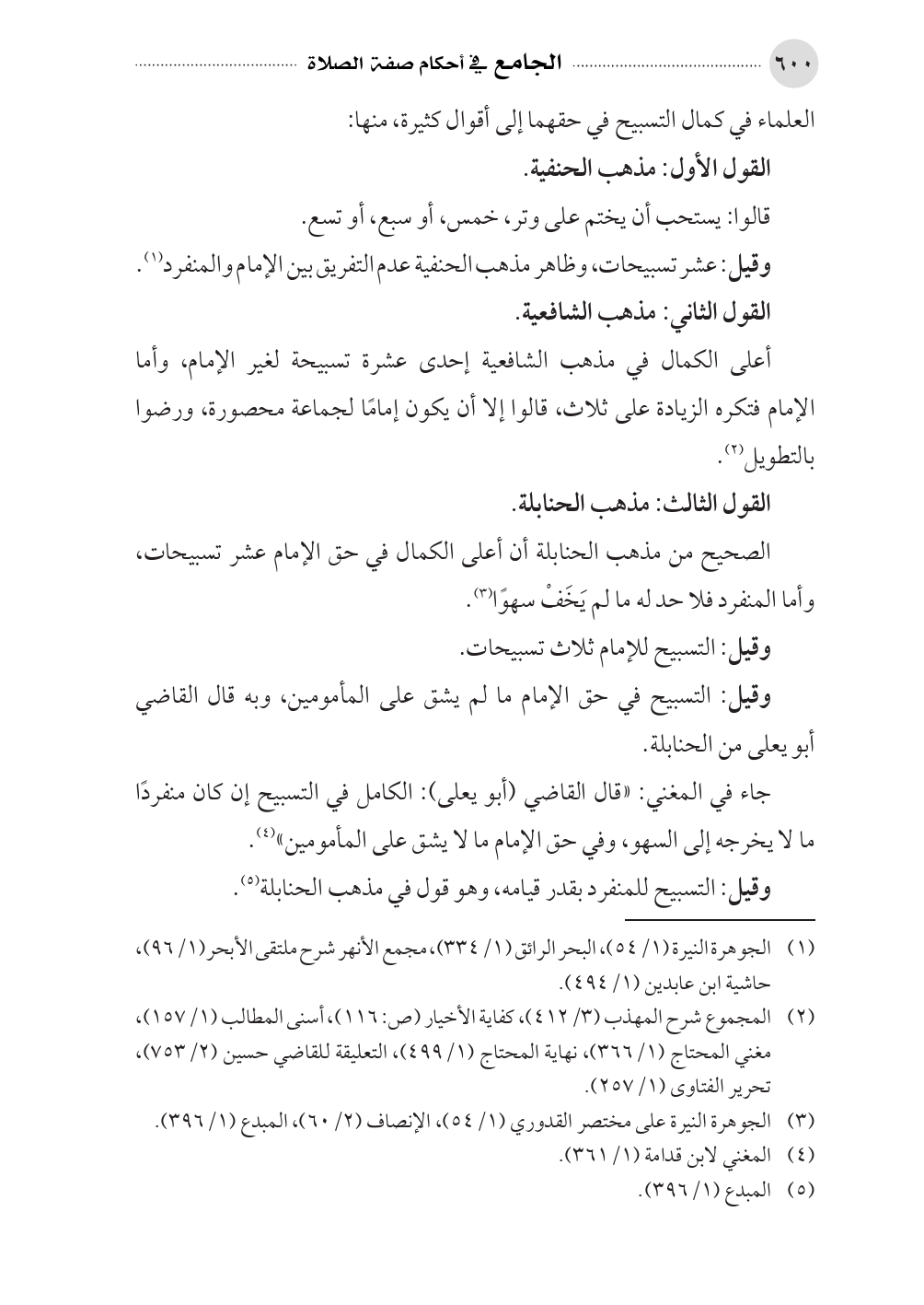 جاء في المغني: «قال القاضي (أبو يعلى): الكامل في التسبيح إن كان منفردًا ما لا يخرجه إلى السهو، وفي حق الإمام ما لا يشق على المأمومين» (¬٤).