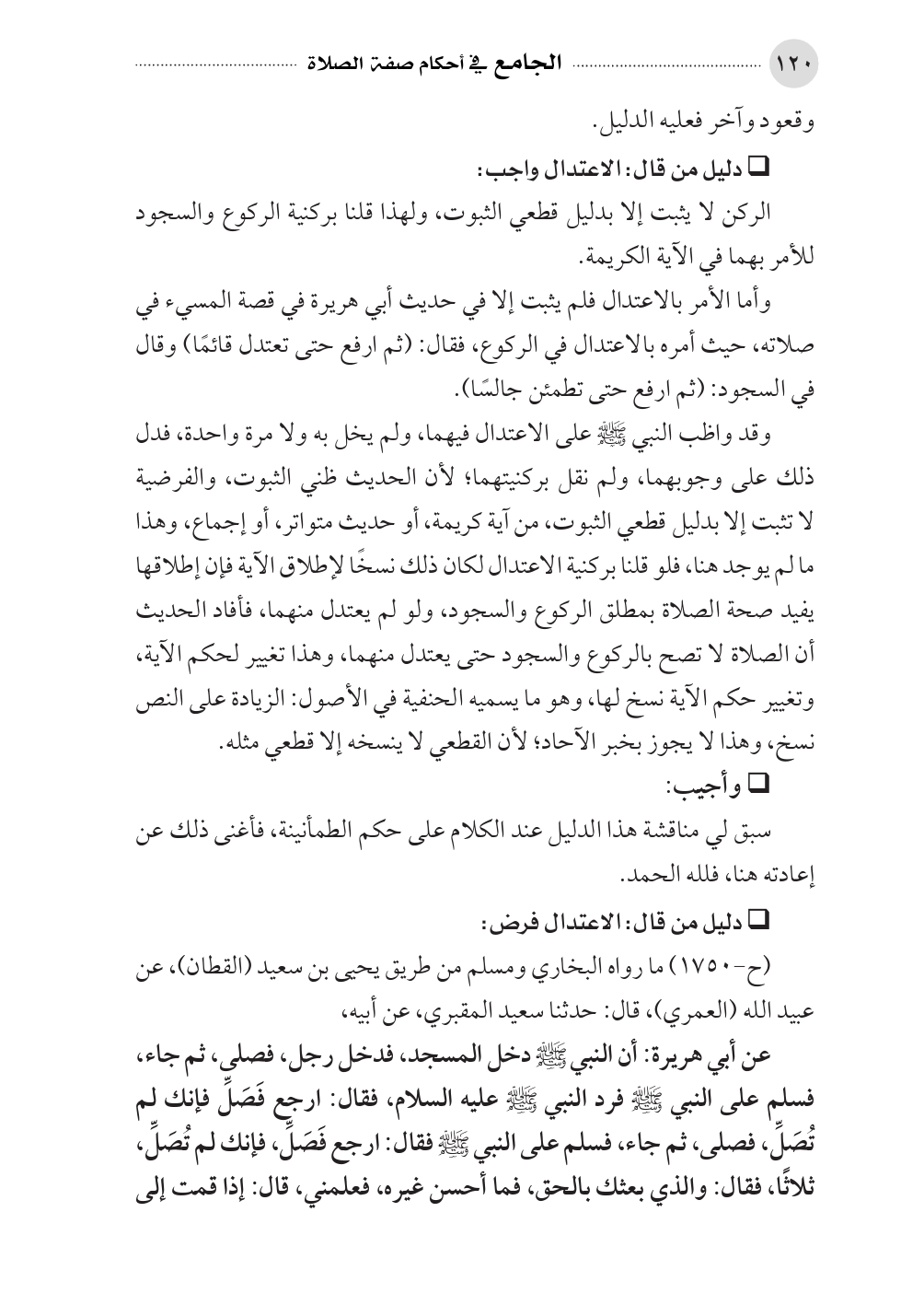 وقد واظب النبي - صلى الله عليه وسلم - على الاعتدال فيهما، ولم يخل به ولا مرة واحدة، فدل ذلك على وجوبهما، ولم نقل بركنيتهما؛ لأن الحديث ظني الثبوت، والفرضية لا تثبت إلا بدليل قطعي الثبوت، من آية كريمة، أو حديث متواتر، أو إجماع، وهذا ما لم يوجد هنا، فلو قلنا بركنية الاعتدال لكان ذلك نسخًا لإطلاق الآية فإن إطلاقها يفيد صحة الصلاة بمطلق الركوع والسجود، ولو لم يعتدل منهما، فأفاد الحديث أن الصلاة لا تصح بالركوع والسجود حتى يعتدل منهما، وهذا تغيير لحكم الآية، وتغيير حكم الآية نسخ لها، وهو ما يسميه الحنفية في الأصول: الزيادة على النص نسخ، وهذا لا يجوز بخبر الآحاد؛ لأن القطعي لا ينسخه إلا قطعي مثله.