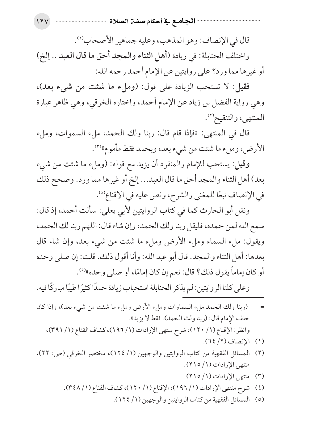 ونقل أبو الحارث كما في كتاب الروايتين لأبي يعلى: سألت أحمد، إذ قال: سمع الله لمن حمده، فليقل ربنا ولك الحمد، وإن شاء قال: اللهم ربنا لك الحمد، ويقول: ملء السماء وملء الأرض وملء ما شئت من شيء بعد، وإن شاء قال بعدها: أهل الثناء والمجد. قال أبو عبد الله: وأنا أقول ذلك. قلت: إن صلى وحده أو كان إماماً يقول ذلك؟ قال: نعم إن كان إمامًا، أو صلى وحده» (¬٥).
