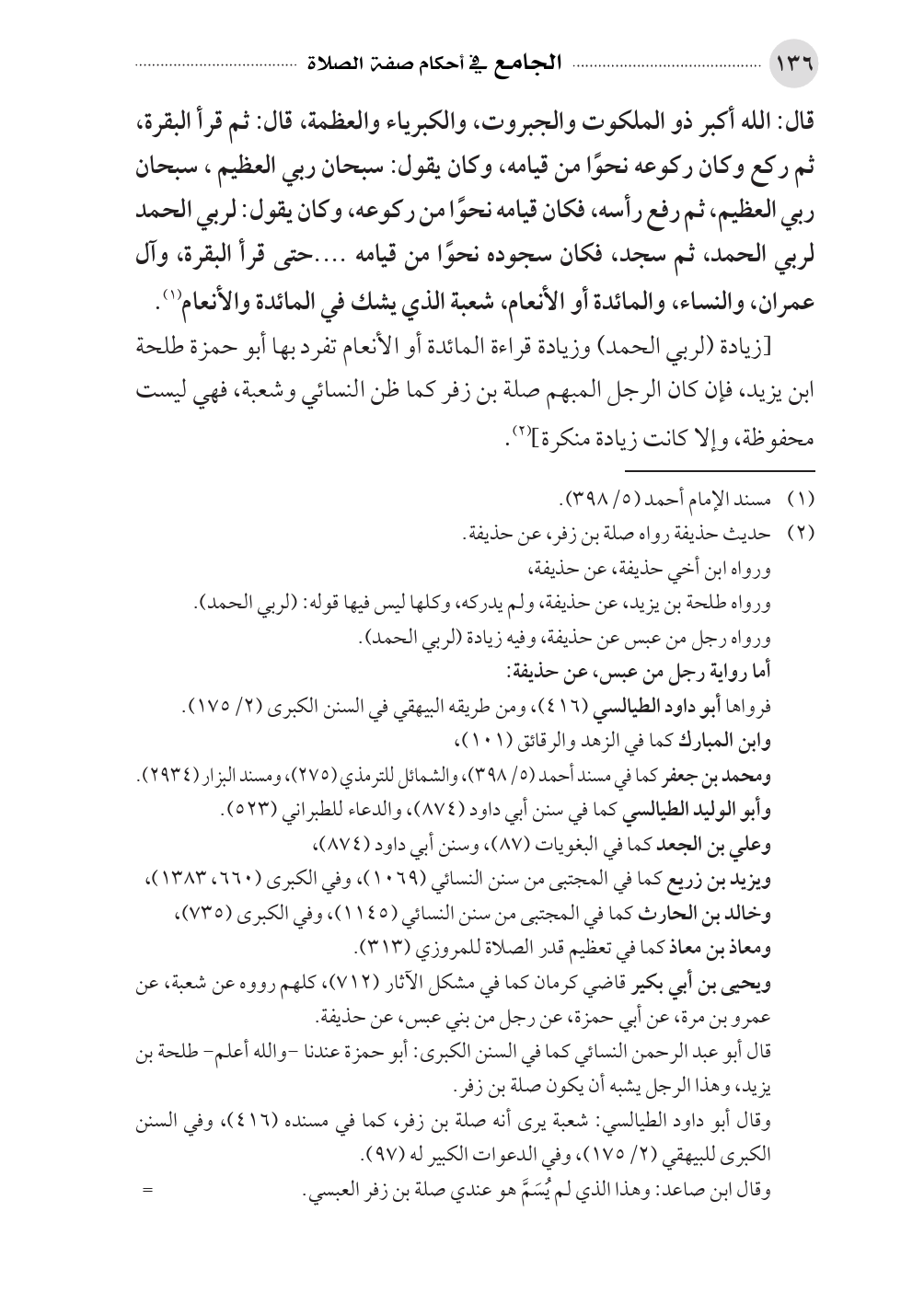 [زيادة (لربي الحمد) وزيادة قراءة المائدة أو الأنعام تفرد بها أبو حمزة طلحة ابن يزيد، فإن كان الرجل المبهم صلة بن زفر كما ظن النسائي وشعبة، فهي ليست محفوظة، وإلا كانت زيادة منكرة] (¬٢).