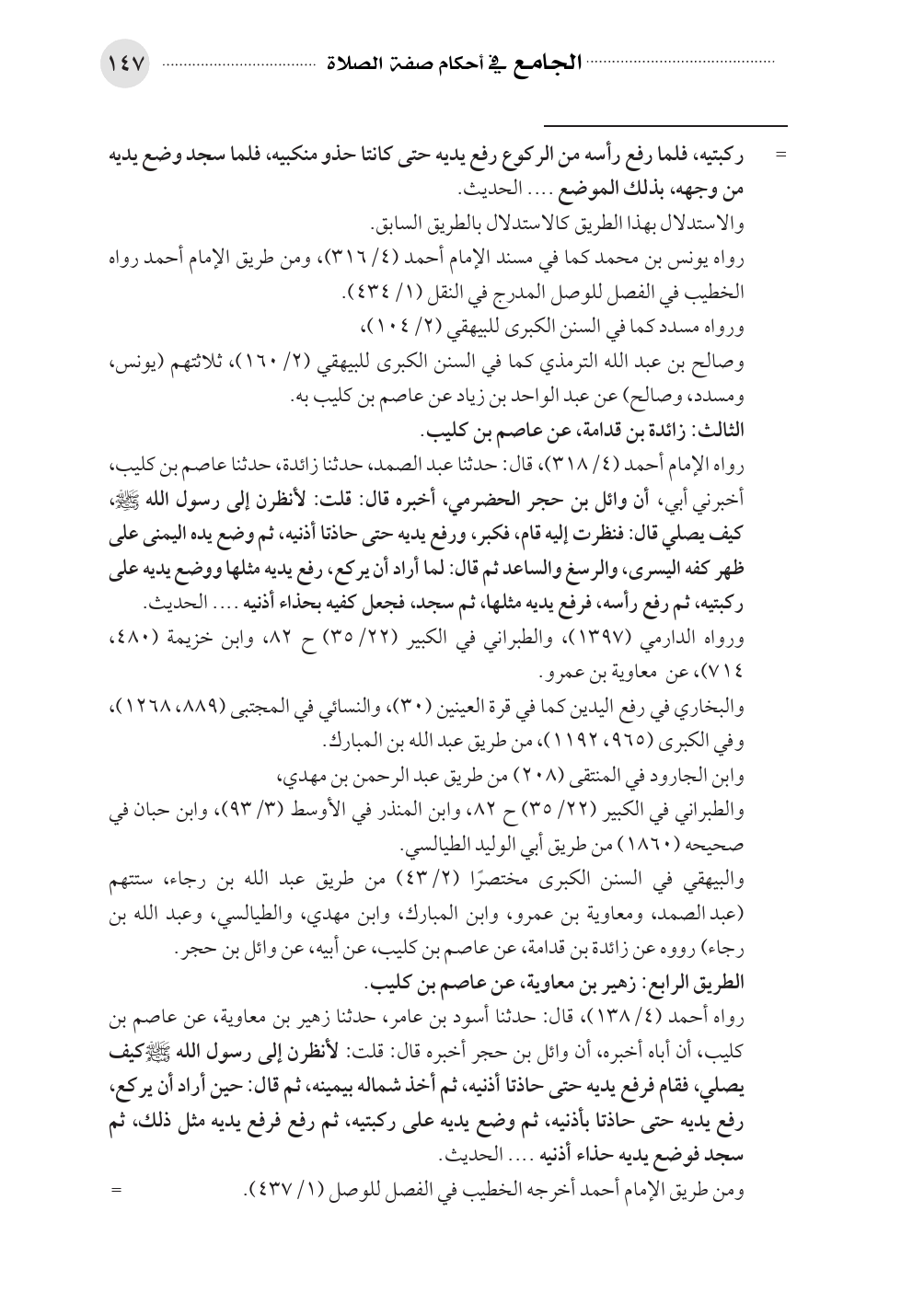 رواه الإمام أحمد (٤/ ٣١٨)، قال: حدثنا عبد الصمد، حدثنا زائدة، حدثنا عاصم بن كليب، أخبرني أبي، ... أن وائل بن حجر الحضرمي، أخبره قال: قلت: لأنظرن إلى رسول الله - صلى الله عليه وسلم -، كيف يصلي قال: فنظرت إليه قام، فكبر، ورفع يديه حتى حاذتا أذنيه، ثم وضع يده اليمنى على ظهر كفه اليسرى، والرسغ والساعد ثم قال: لما أراد أن يركع، رفع يديه مثلها ووضع يديه على ركبتيه، ثم رفع رأسه، فرفع يديه مثلها، ثم سجد، فجعل كفيه بحذاء أذنيه .... الحديث.