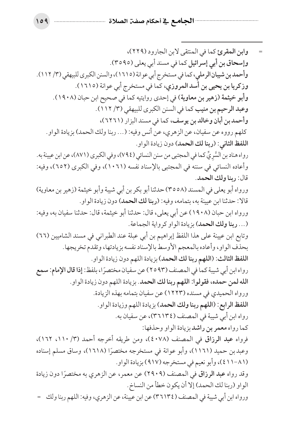 ورواه ابن أبي شيبة في المصنف (٣٦١٣٤) عن ابن عيينة، عن الزهري، وفيه: اللهم ربنا ولك الحمد، فزاد اللهم، وزاد الواو.