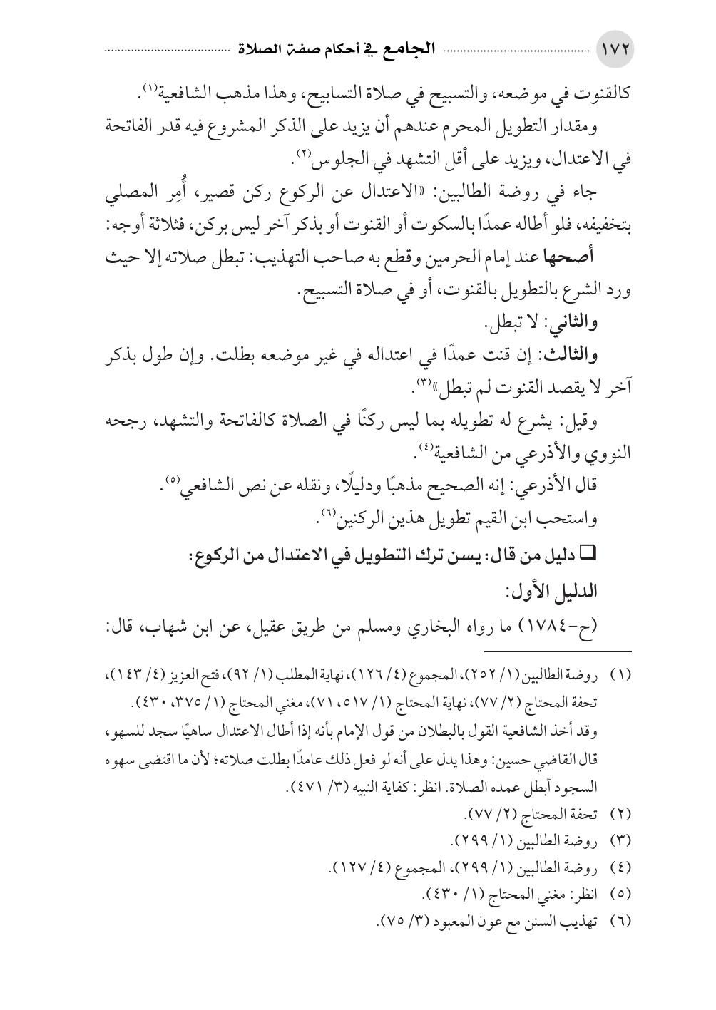 جاء في روضة الطالبين: «الاعتدال عن الركوع ركن قصير، أُمِر المصلي بتخفيفه، فلو أطاله عمدًا بالسكوت أو القنوت أو بذكر آخر ليس بركن، فثلاثة أوجه:
