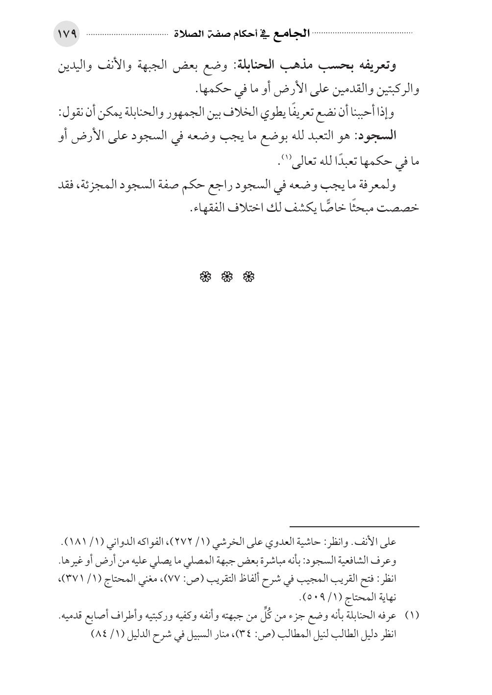 (¬١). عرفه الحنابلة بأنه وضع جزء من كُلٍّ من جبهته وأنفه وكفيه وركبتيه وأطراف أصابع قدميه. انظر دليل الطالب لنيل المطالب (ص: ٣٤)، منار السبيل في شرح الدليل (١/ ٨٤)