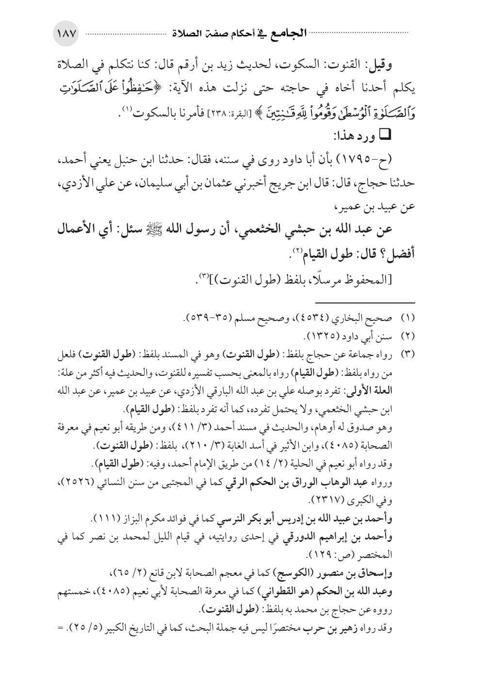 (¬٣). رواه جماعة عن حجاج بلفظ: (طول القنوت) وهو في المسند بلفظ: (طول القنوت) فلعل من رواه بلفظ: (طول القيام) رواه بالمعنى بحسب تفسيره للقنوت، والحديث فيه أكثر من علة: