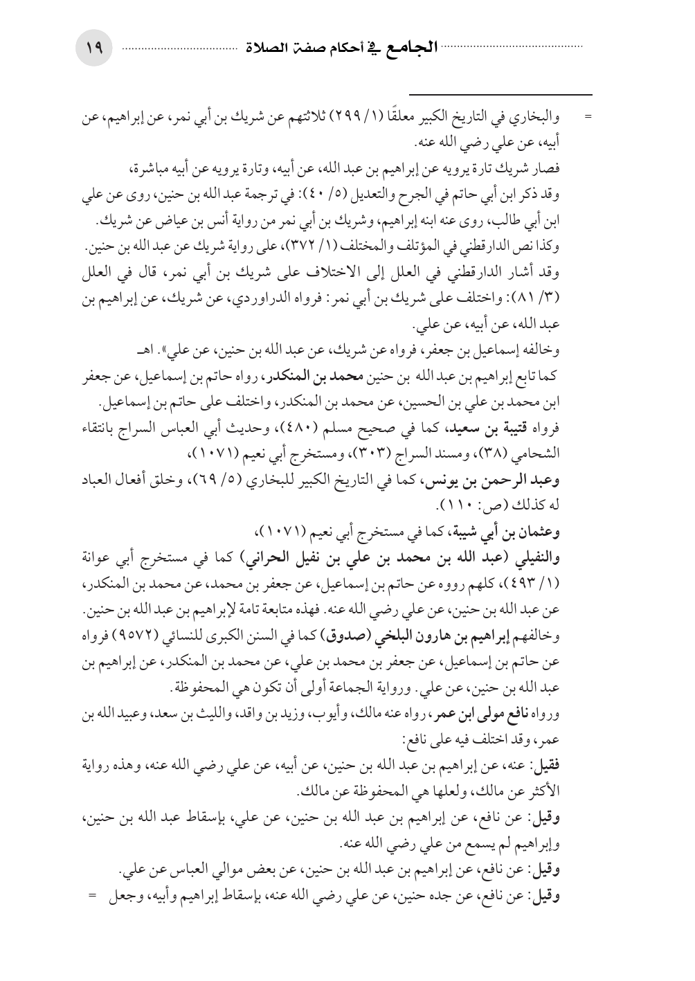 = والبخاري في التاريخ الكبير معلقًا (١/ ٢٩٩) ثلاثتهم عن شريك بن أبي نمر، عن إبراهيم، عن أبيه، عن علي رضي الله عنه.