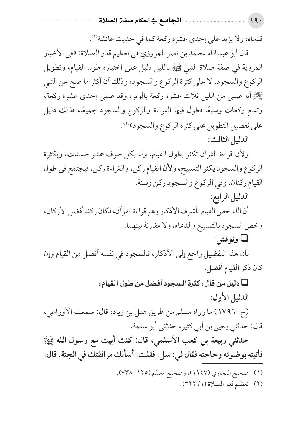 قال أبو عبد الله محمد بن نصر المروزي في تعظيم قدر الصلاة: «في الأخبار المروية في صفة صلاة النبي - صلى الله عليه وسلم - بالليل دليل على اختياره طول القيام، وتطويل الركوع والسجود، لا على كثرة الركوع والسجود، وذلك أن أكثر ما صح عن النبي - صلى الله عليه وسلم - أنه صلى من الليل ثلاث عشرة ركعة بالوتر، وقد صلى إحدى عشرة ركعة، وتسع ركعات وسبعًا فطول فيها القراءة والركوع والسجود جميعًا، فذلك دليل على تفضيل التطويل على كثرة الركوع والسجود» (¬٢).