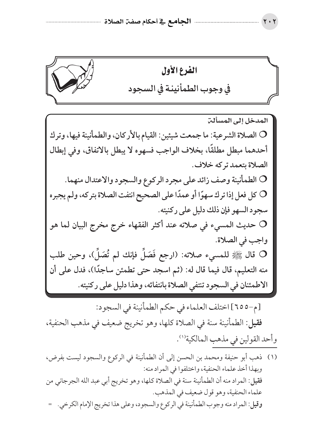 (¬١). ذهب أبو حنيفة ومحمد بن الحسن إلى أن الطمأنينة في الركوع والسجود ليست بفرض، وبهذا أخذ علماء الحنفية، واختلفوا في المراد منه: