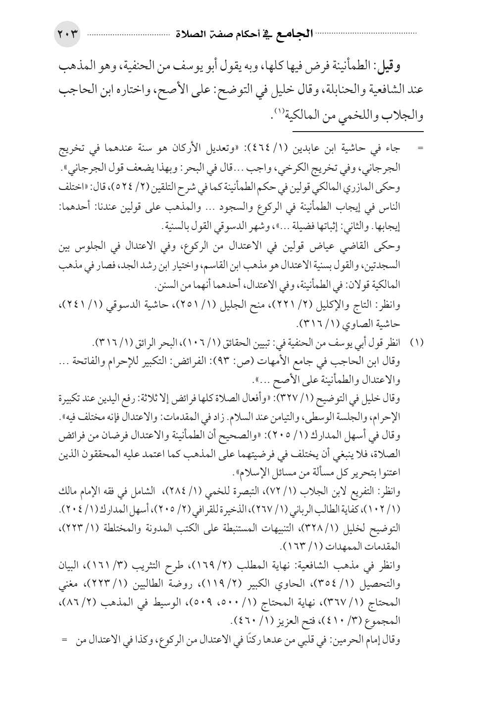 وقيل: الطمأنينة فرض فيها كلها، وبه يقول أبو يوسف من الحنفية، وهو المذهب عند الشافعية والحنابلة، وقال خليل في التوضح: على الأصح، واختاره ابن الحاجب والجلاب واللخمي من المالكية (¬١).