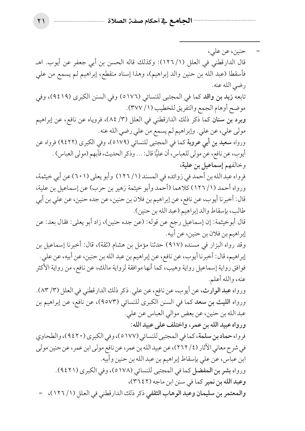 ورواه أحمد (١/ ١٢٦) كلاهما (أحمد وأبو خيثمة زهير بن حرب) عن إسماعيل بن علية، قال: أخبرنا أيوب، عن نافع، عن إبراهيم بن فلان بن حنين، عن جده حنين، عن علي بن أبي طالب، بإسقاط والد إبراهيم (عبد الله بن حنين).