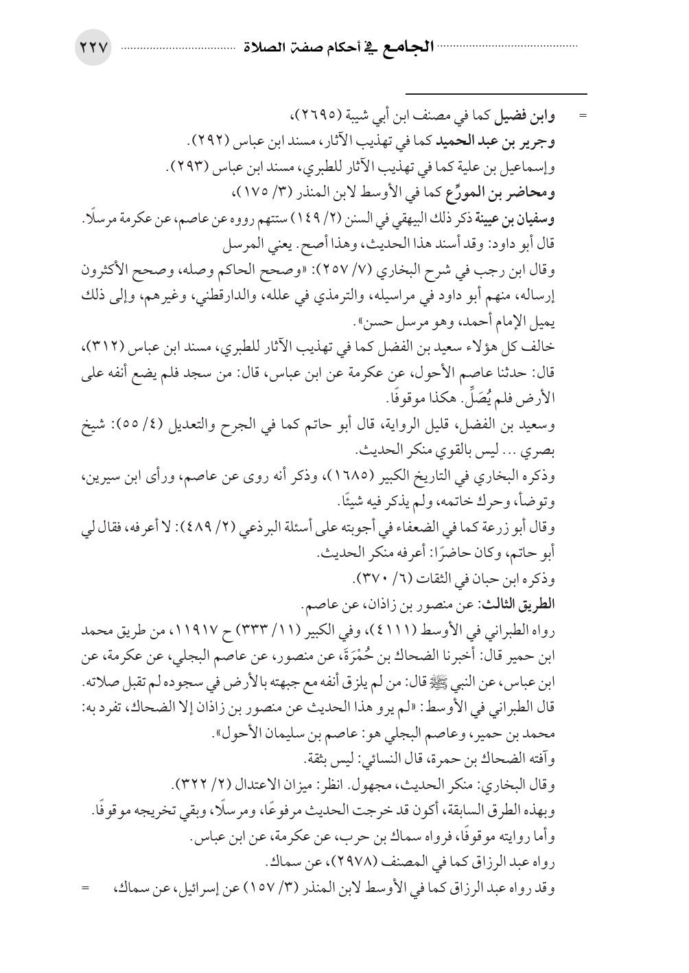 خالف كل هؤلاء سعيد بن الفضل كما في تهذيب الآثار للطبري، مسند ابن عباس (٣١٢)، قال: حدثنا عاصم الأحول، عن عكرمة عن ابن عباس، قال: من سجد فلم يضع أنفه على الأرض فلم يُصَلِّ. هكذا موقوفًا.