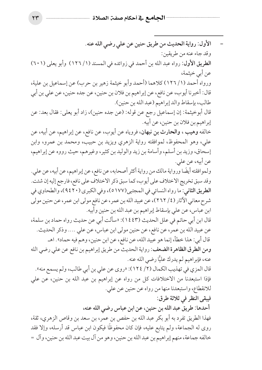 ورواه أحمد (١/ ١٢٦) كلاهما (أحمد وأبو خيثمة زهير بن حرب) عن إسماعيل بن علية، قال: أخبرنا أيوب، عن نافع، عن إبراهيم بن فلان بن حنين، عن جده حنين، عن علي بن أبي طالب، بإسقاط والد إبراهيم (عبد الله بن حنين).