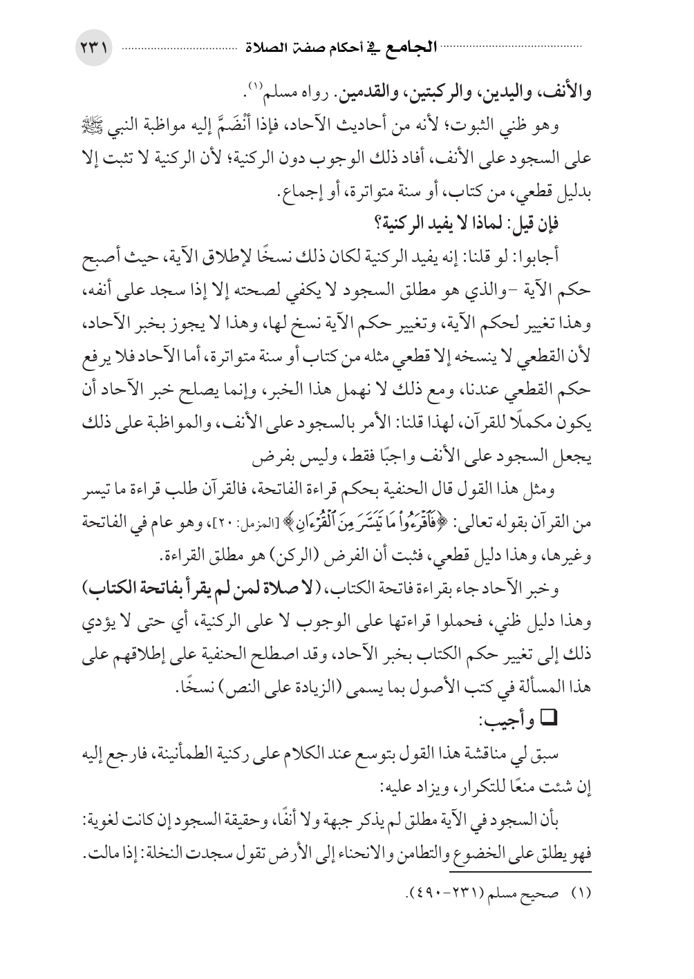 أجابوا: لو قلنا: إنه يفيد الركنية لكان ذلك نسخًا لإطلاق الآية، حيث أصبح حكم الآية -والذي هو مطلق السجود لا يكفي لصحته إلا إذا سجد على أنفه، وهذا تغيير لحكم الآية، وتغيير حكم الآية نسخ لها، وهذا لا يجوز بخبر الآحاد، لأن القطعي لا ينسخه إلا قطعي مثله من كتاب أو سنة متواترة، أما الآحاد فلا يرفع حكم القطعي عندنا، ومع ذلك لا نهمل هذا الخبر، وإنما يصلح خبر الآحاد أن يكون مكملًا للقرآن، لهذا قلنا: الأمر بالسجود على الأنف، والمواظبة على ذلك يجعل السجود على الأنف واجبًا فقط، وليس بفرض