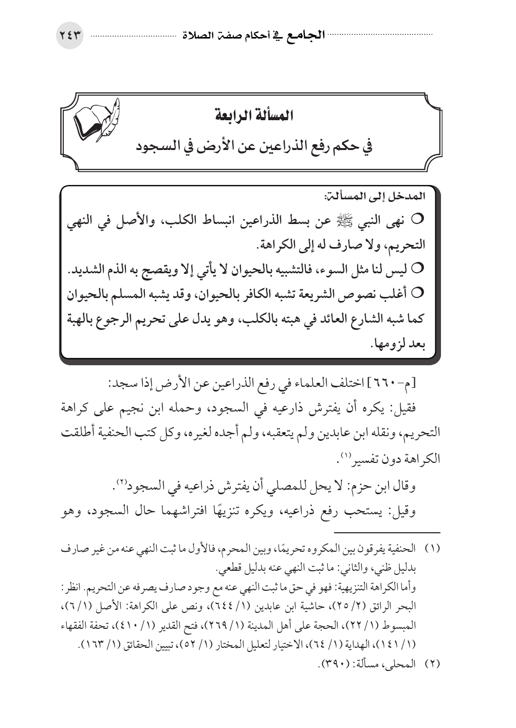 المسألة الرابعة في حكم رفع الذراعين عن الأرض في السجود