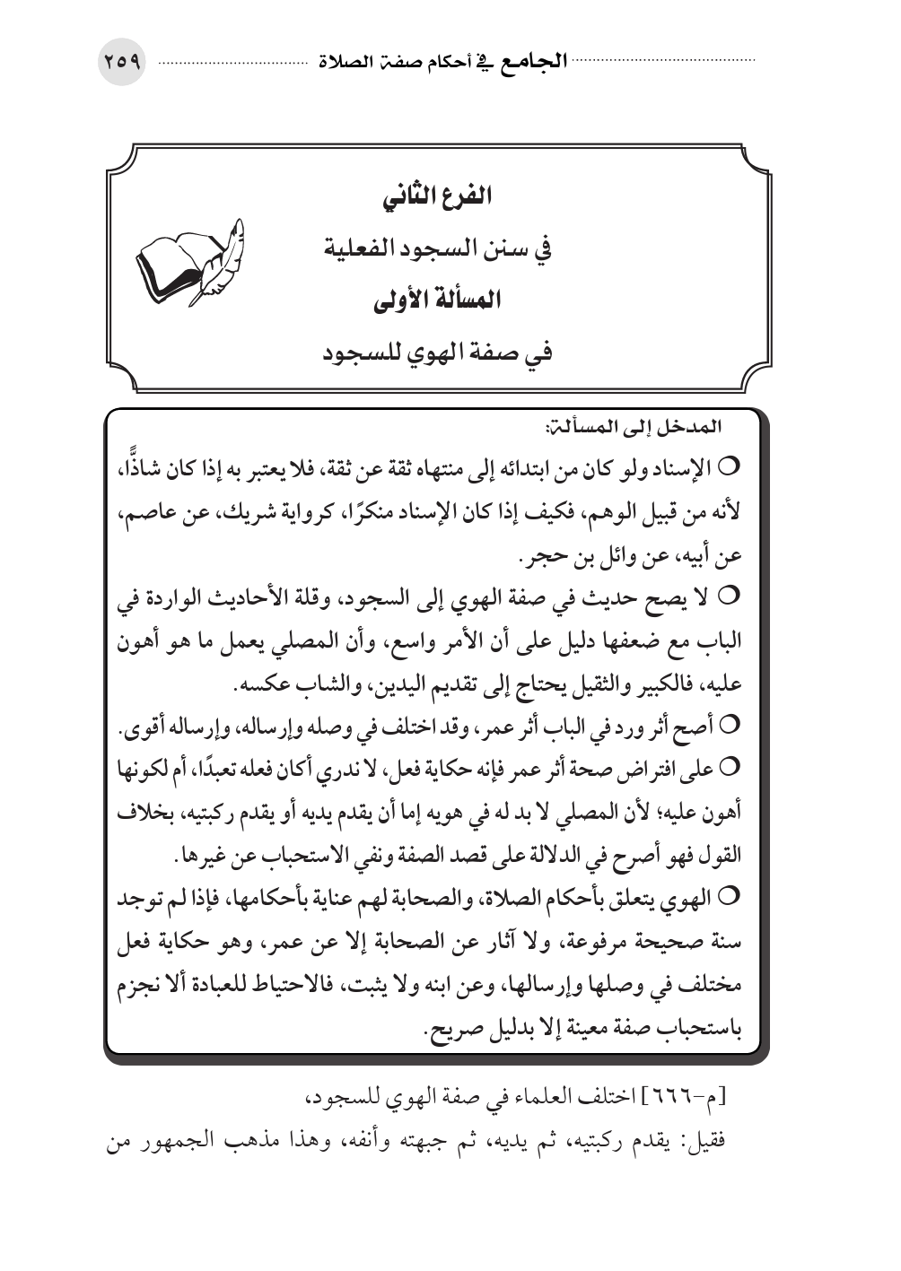 • لا يصح حديث في صفة الهوي إلى السجود، وقلة الأحاديث الواردة في الباب مع ضعفها دليل على أن الأمر واسع، وأن المصلي يعمل ما هو أهون عليه، فالكبير والثقيل يحتاج إلى تقديم اليدين، والشاب عكسه.