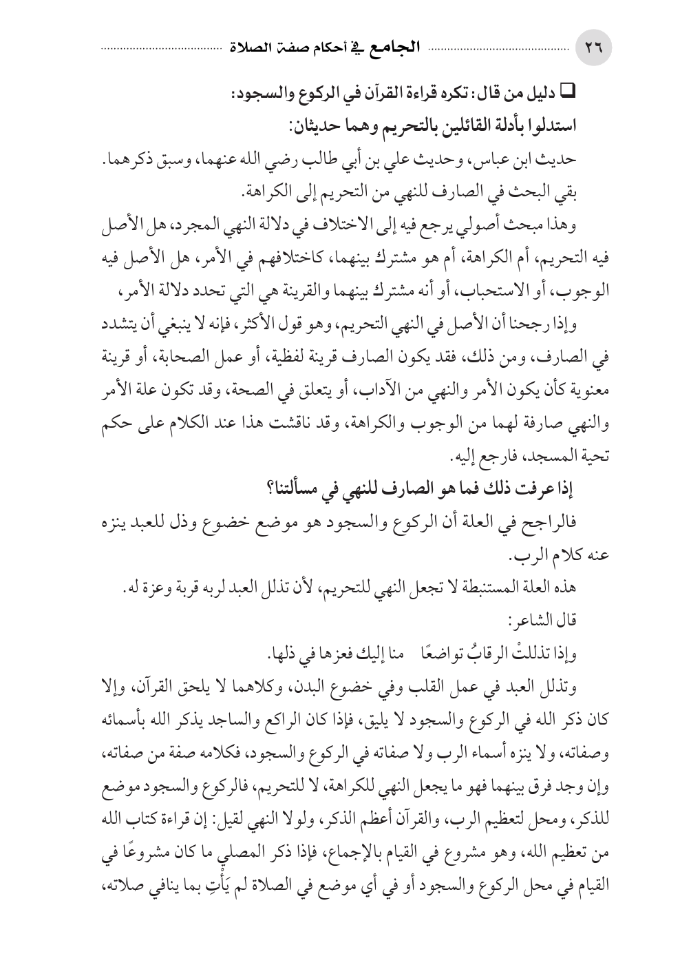 وتذلل العبد في عمل القلب وفي خضوع البدن، وكلاهما لا يلحق القرآن، وإلا كان ذكر الله في الركوع والسجود لا يليق، فإذا كان الراكع والساجد يذكر الله بأسمائه وصفاته، ولا ينزه أسماء الرب ولا صفاته في الركوع والسجود، فكلامه صفة من صفاته، وإن وجد فرق بينهما فهو ما يجعل النهي للكراهة، لا للتحريم، فالركوع والسجود موضع للذكر، ومحل لتعظيم الرب، والقرآن أعظم الذكر، ولولا النهي لقيل: إن قراءة كتاب الله من تعظيم الله، وهو مشروع في القيام بالإجماع، فإذا ذكر المصلي ما كان مشروعًا في القيام في محل الركوع والسجود أو في أي موضع في الصلاة لم يَأْتِ بما ينافي صلاته،