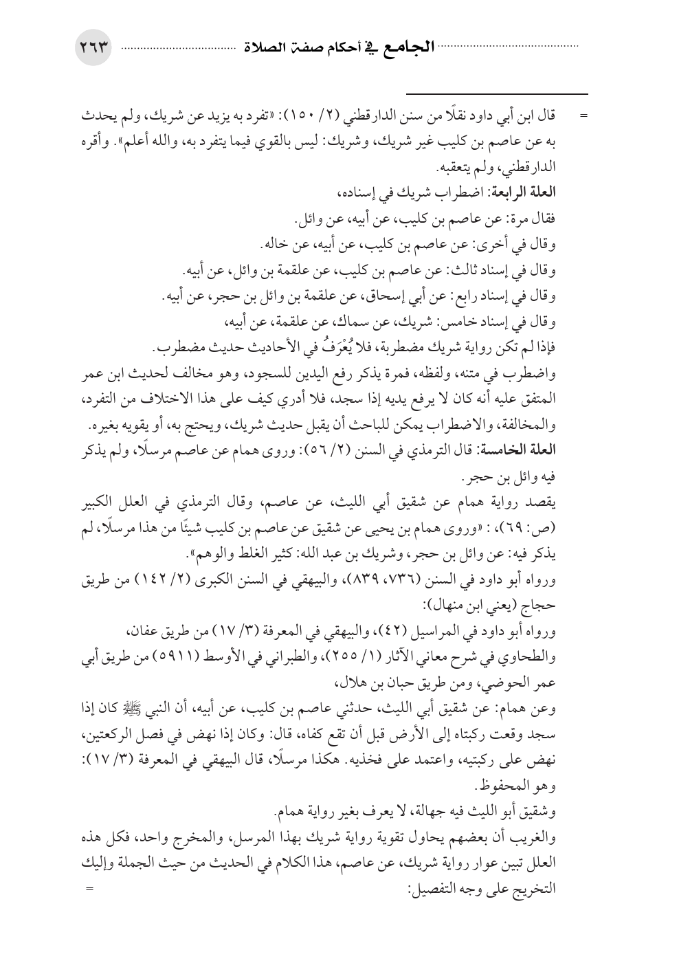 = قال ابن أبي داود نقلًا من سنن الدارقطني (٢/ ١٥٠): «تفرد به يزيد عن شريك، ولم يحدث به عن عاصم بن كليب غير شريك، وشريك: ليس بالقوي فيما يتفرد به، والله أعلم». وأقره الدارقطني، ولم يتعقبه.
