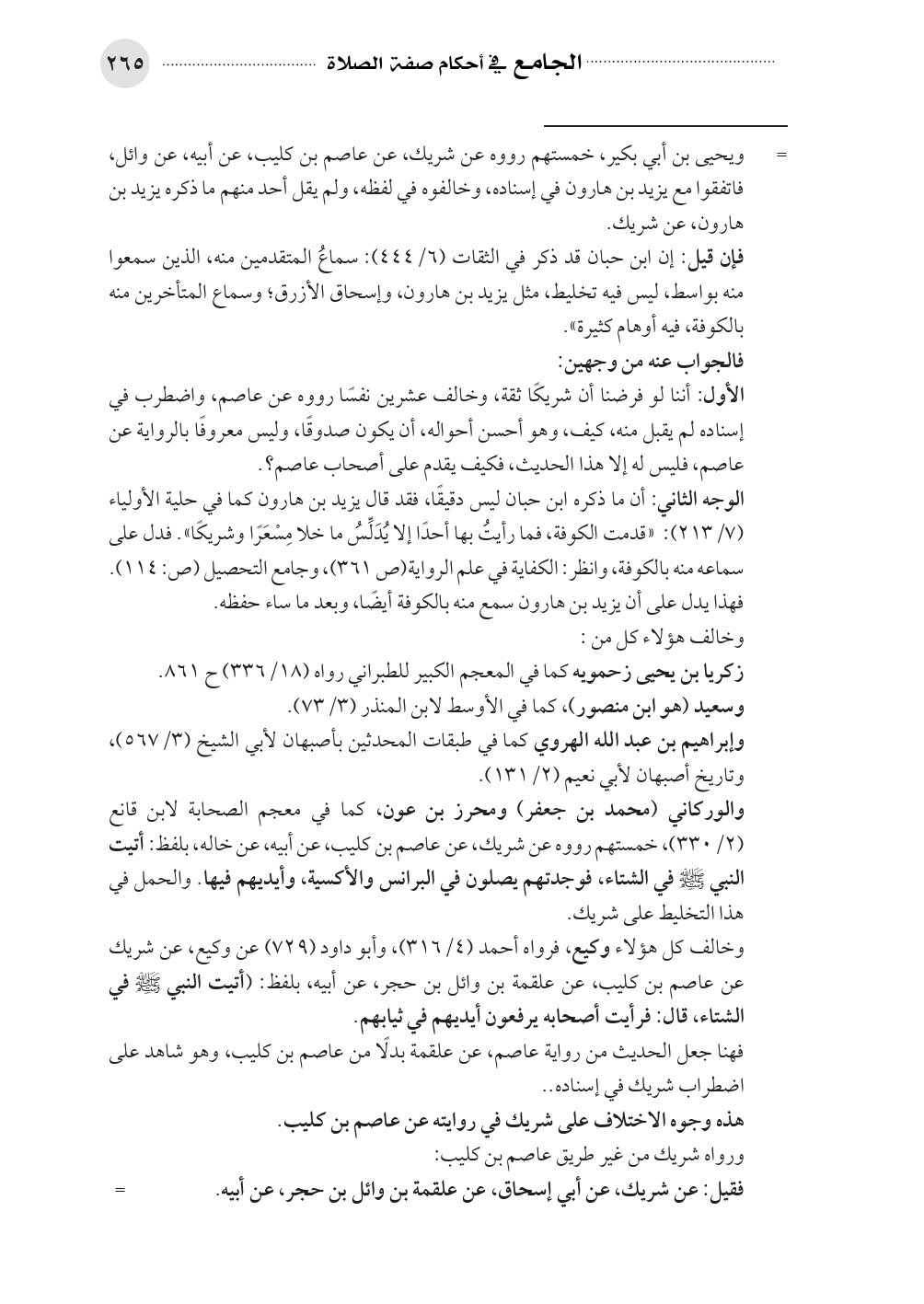 وخالف كل هؤلاء وكيع، فرواه أحمد (٤/ ٣١٦)، وأبو داود (٧٢٩) عن وكيع، عن شريك عن عاصم بن كليب، عن علقمة بن وائل بن حجر، عن أبيه، بلفظ: (أتيت النبي - صلى الله عليه وسلم - في الشتاء، قال: فرأيت أصحابه يرفعون أيديهم في ثيابهم.