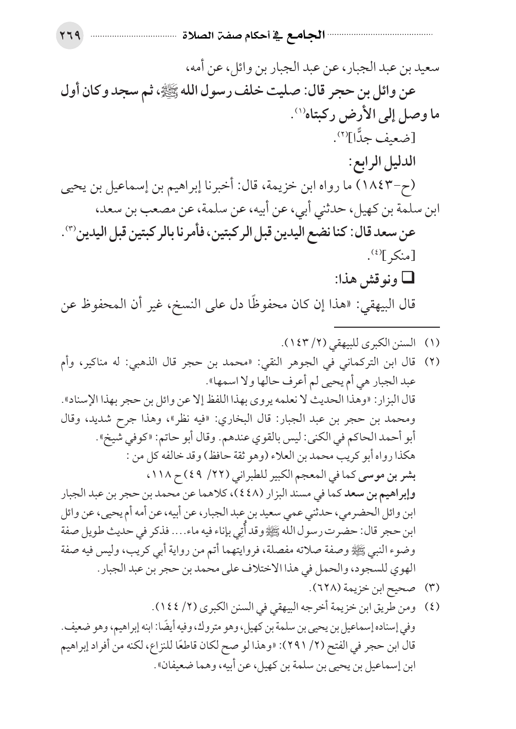 (¬٢). قال ابن التركماني في الجوهر النقي: «محمد بن حجر قال الذهبي: له مناكير، وأم عبد الجبار هي أم يحيى لم أعرف حالها ولا اسمها».