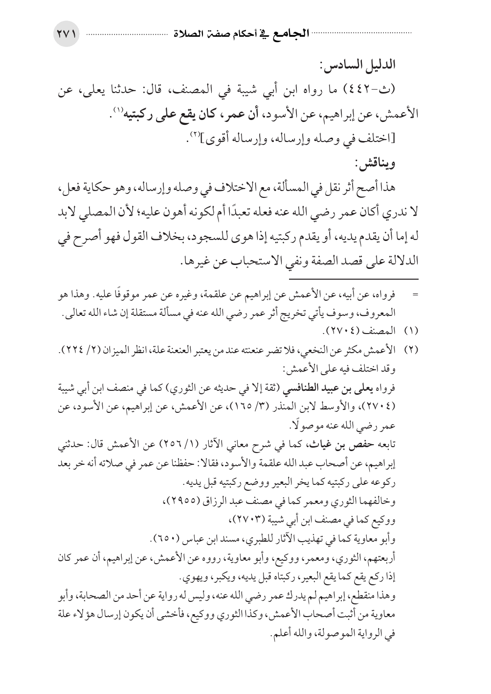 تابعه حفص بن غياث، كما في شرح معاني الآثار (١/ ٢٥٦) عن الأعمش قال: حدثني إبراهيم، عن أصحاب عبد الله علقمة والأسود، فقالا: حفظنا عن عمر في صلاته أنه خر بعد ركوعه على ركبتيه كما يخر البعير ووضع ركبتيه قبل يديه.