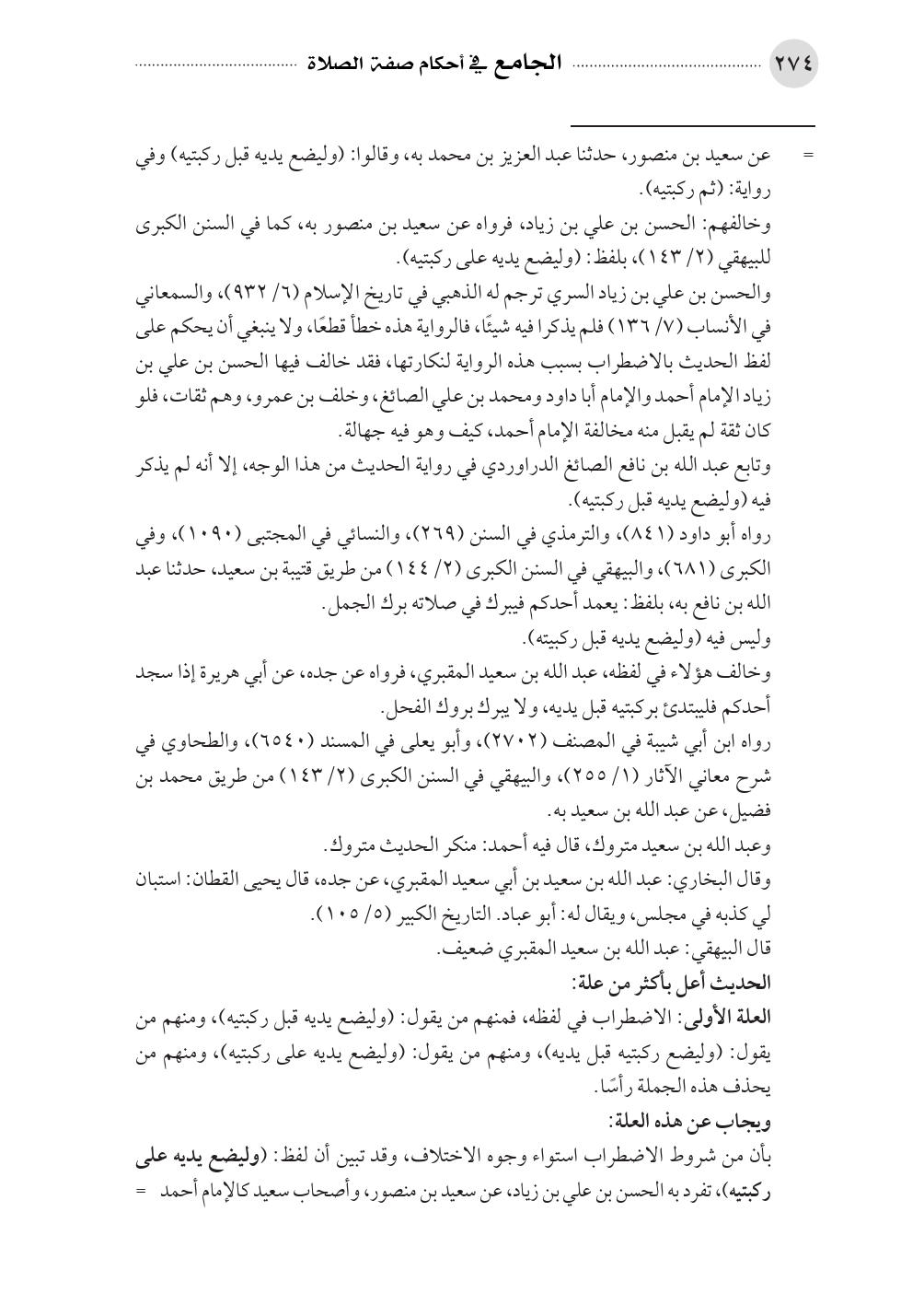 = ... عن سعيد بن منصور، حدثنا عبد العزيز بن محمد به، وقالوا: (وليضع يديه قبل ركبتيه) وفي رواية: (ثم ركبتيه).