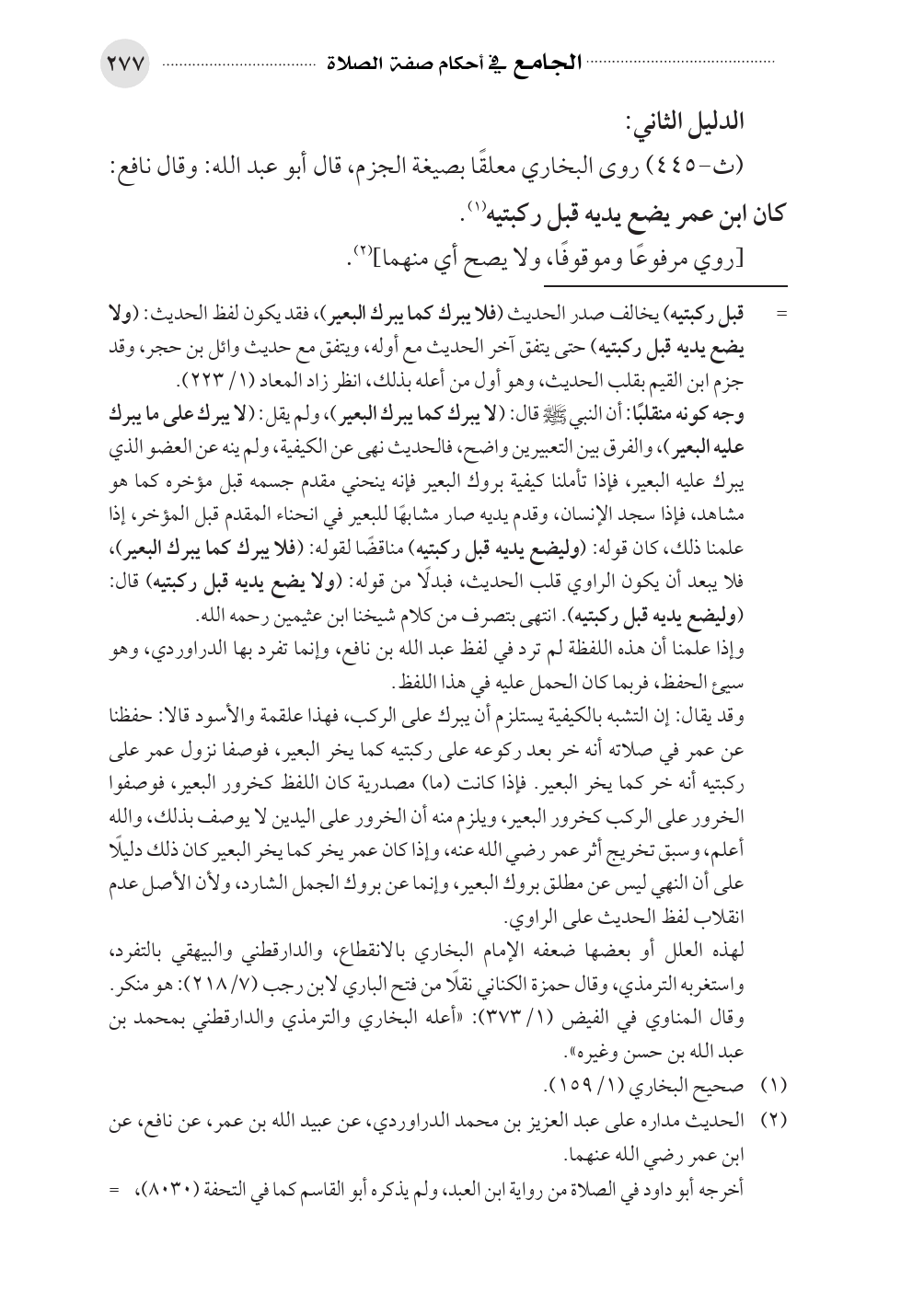وقد يقال: إن التشبه بالكيفية يستلزم أن يبرك على الركب، فهذا علقمة والأسود قالا: حفظنا عن عمر في صلاته أنه خر بعد ركوعه على ركبتيه كما يخر البعير، فوصفا نزول عمر على ركبتيه أنه خر كما يخر البعير. فإذا كانت (ما) مصدرية كان اللفظ كخرور البعير، فوصفوا الخرور على الركب كخرور البعير، ويلزم منه أن الخرور على اليدين لا يوصف بذلك، والله أعلم، وسبق تخريج أثر عمر رضي الله عنه، وإذا كان عمر يخر كما يخر البعير كان ذلك دليلًا على أن النهي ليس عن مطلق بروك البعير، وإنما عن بروك الجمل الشارد، ولأن الأصل عدم انقلاب لفظ الحديث على الراوي.