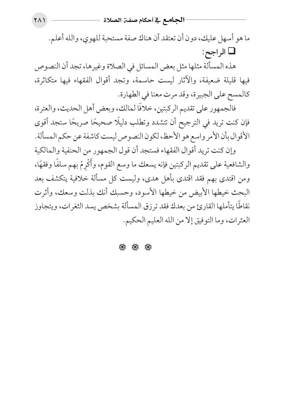 وإن كنت تريد أقوال الفقهاء فستجد أن قول الجمهور من الحنفية والمالكية والشافعية على تقديم الركبتين فإنه يسعك ما وسع القوم، وأَكْرِمْ بهم سلفًا وفقهًا، ومن اقتدى بهم فقد اقتدى بأهل هدى، وليست كل مسألة خلافية يتكشف بعد البحث خيطها الأبيض من خيطها الأسود، وحسبك أنك بذلت وسعك، وأثرت نقاطًا يتأملها القارئ من بعدك فقد ترزق المسألة بشخص يسد الثغرات، ويتجاوز العثرات، وما التوفيق إلا من الله العليم الحكيم.