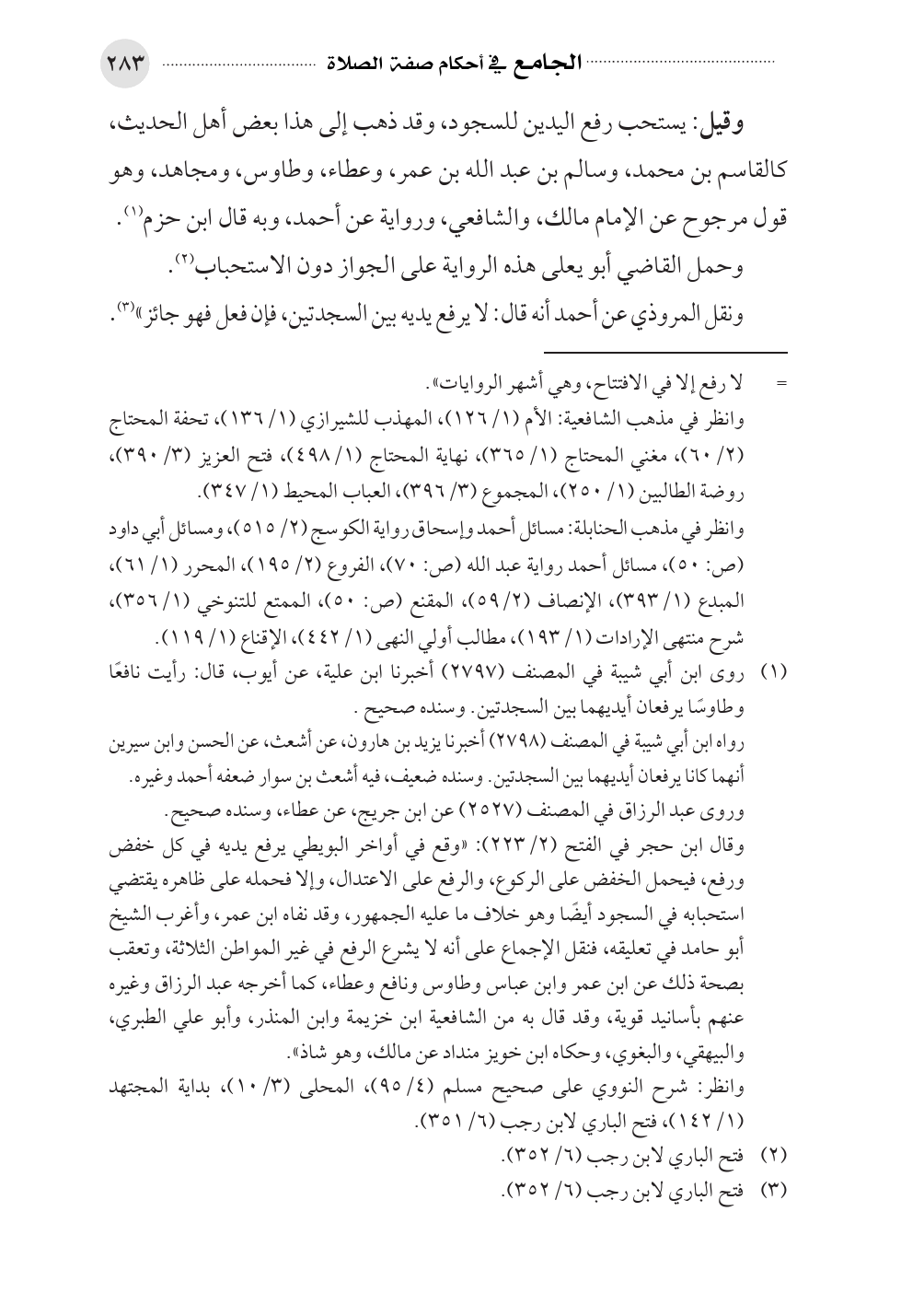 وقيل: يستحب رفع اليدين للسجود، وقد ذهب إلى هذا بعض أهل الحديث، كالقاسم بن محمد، وسالم بن عبد الله بن عمر، وعطاء، وطاوس، ومجاهد، وهو قول مرجوح عن الإمام مالك، والشافعي، ورواية عن أحمد، وبه قال ابن حزم (¬١).