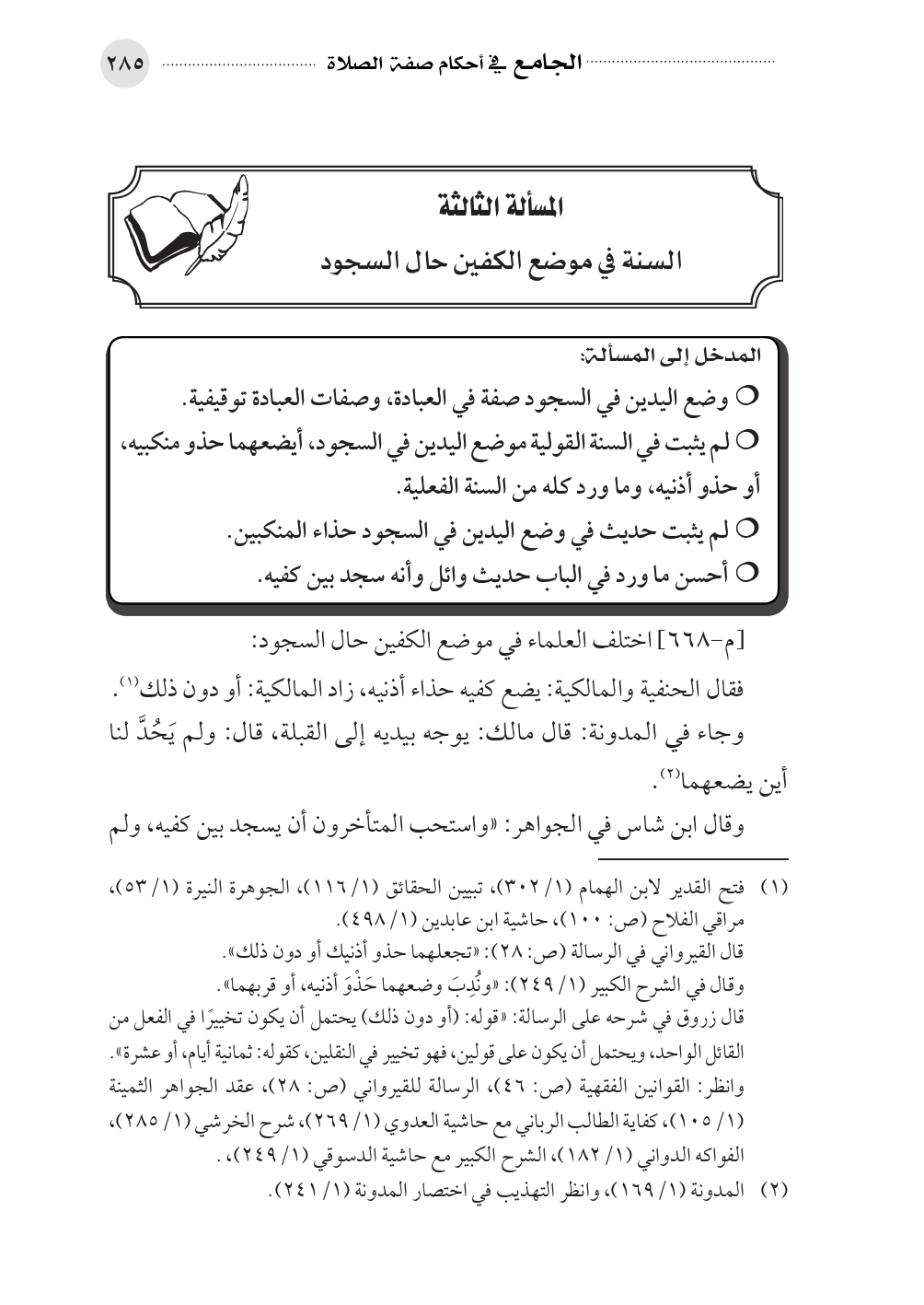 المسألة الثالثة السنة في موضع الكفين حال السجود